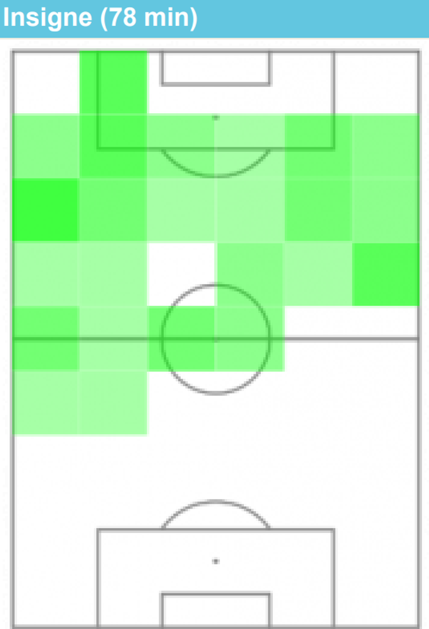 La mappa delle azioni di Insigne contro l’Ucraina mostra come abbia occupato ogni zona dell’attacco azzurro. Con 7 tiri in 2 partite è stato l’azzurro che, assieme a Bernardeschi, ha calciato di più in porta.