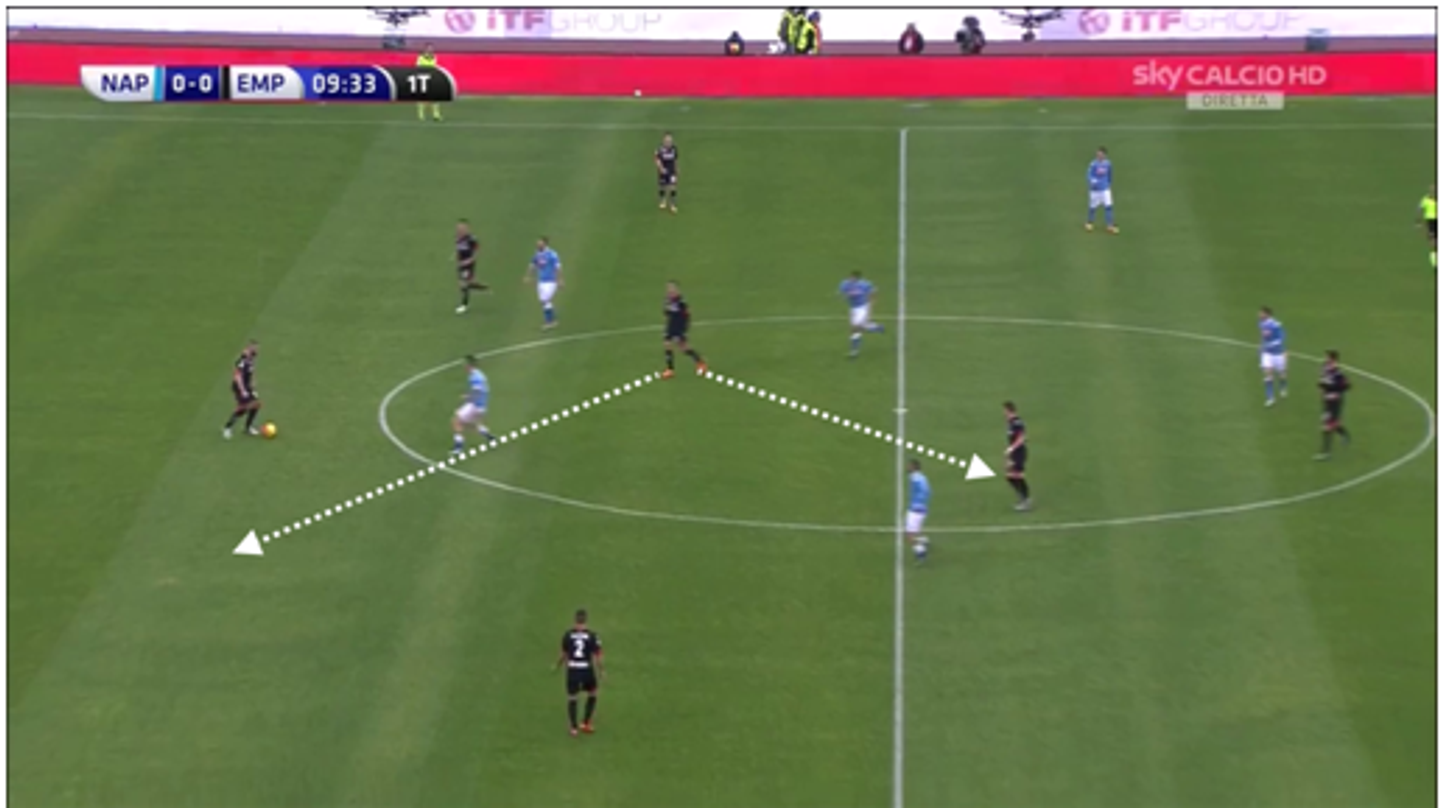 Paredes gioca a tre tocchi massimo. Si muove bene, triangola con i difensori e poi gioca subito il passaggio diagonale di prima intenzione per Zielinski.