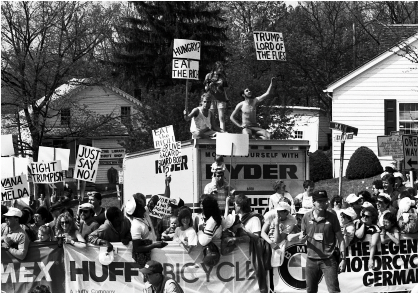 Proteste contro il Tour de Trump e la sua megalomania a New Paltz, durante il Tour de Trump 1989. Foto: Kevin Hogan | Politico.