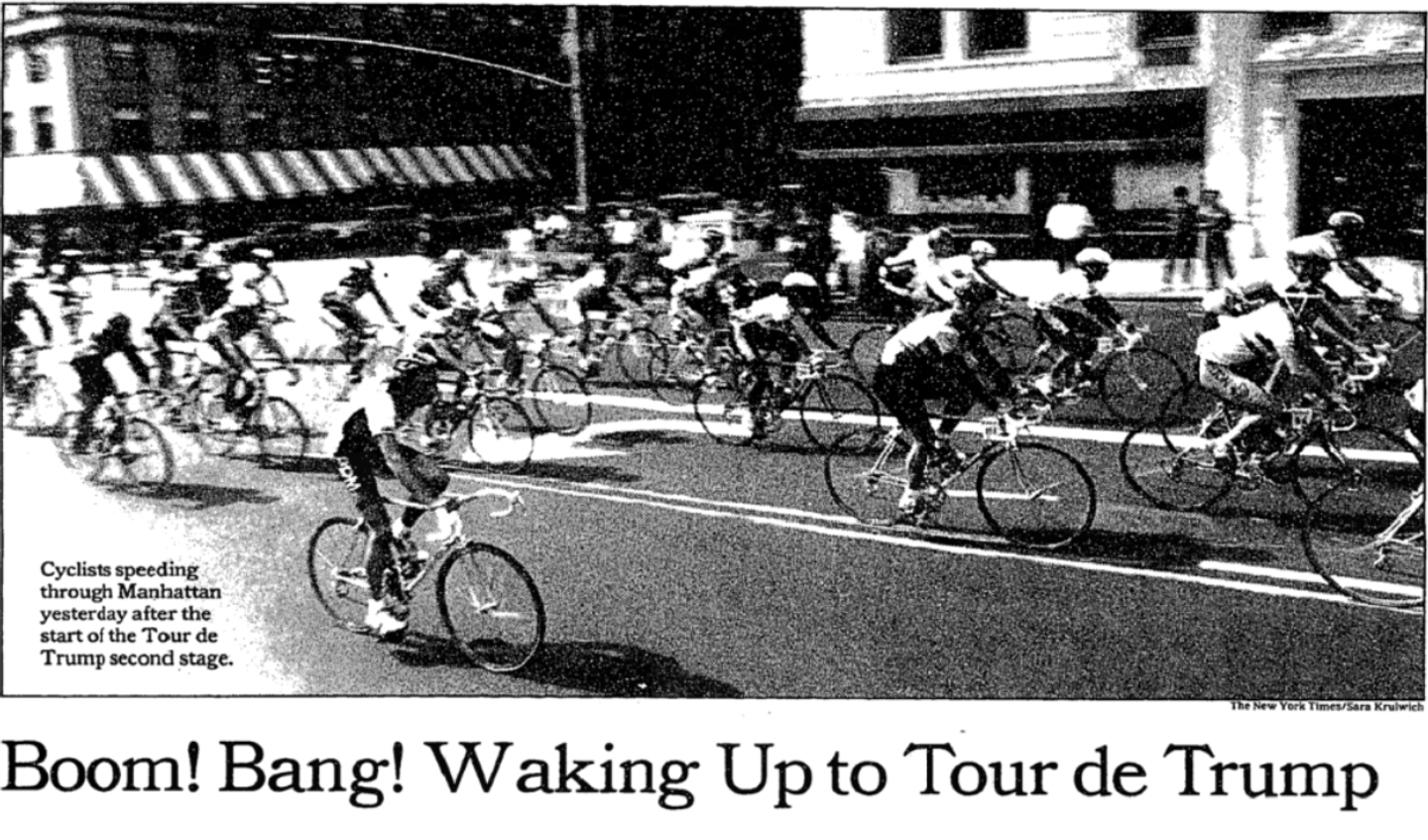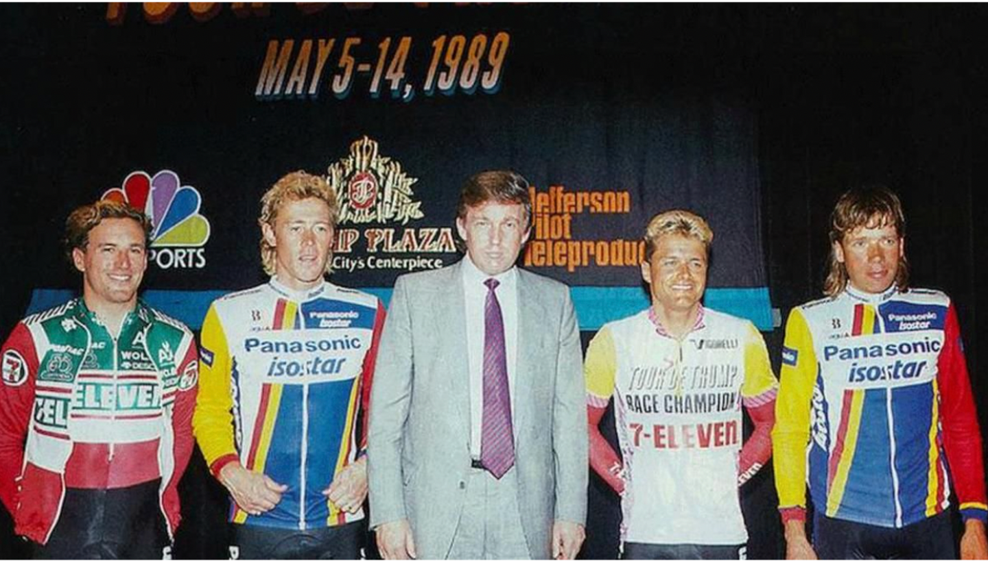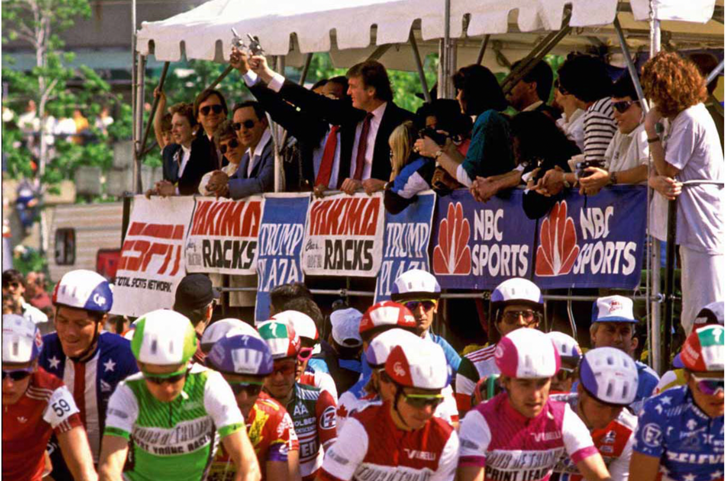 Nel 1988 Trump ha 42 anni, ha preso in mano la ricca società immobiliare di famiglia e si appresta a fare dentro-e-fuori dalla lista di Forbes degli uomini più ricchi del mondo. La presentazione del Tour de Trump (dieci tappe dal 5 al 14 maggio dell’anno successivo, un montepremi totale da $250,000 che fa vacillare alcuni corridori dall’andare alla Vuelta a España, la co-sponsorizzazione di NBC, distribuzione in oltre cento paesi, aperto sia ad amatori che a professionisti) avviene al Plaza Hotel, uno dei più famosi alberghi di Manhattan. Trump lo aveva acquistato pochi mesi prima grazie a oltre $400 milioni prestati da svariate banche.