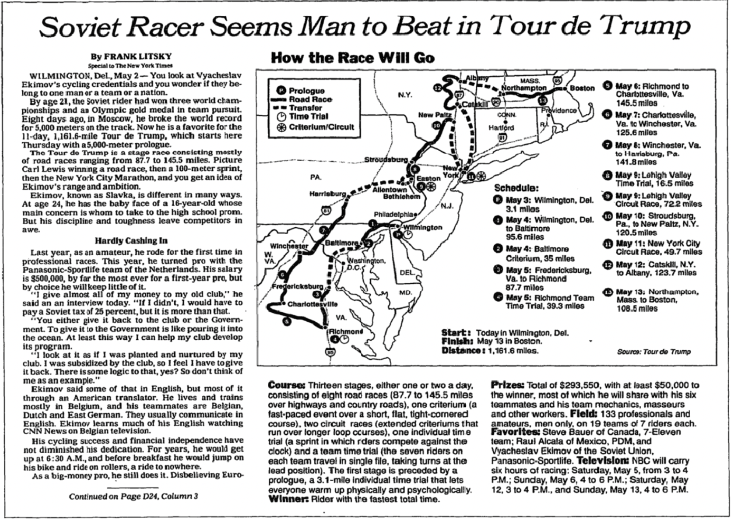Al via del primo Tour de Trump ci sono otto squadre professionistiche, undici dilettantistiche (tra queste la Sauna Diana, sponsorizzata da un locale a luci rosse di Amsterdam) e pure LeMond. Alcuni dei suoi rivali più quotati in questa corsa, Steven Rooks, Eric Vanderaerden e Viatcheslav Ekimov, «non sono conosciuti qui» ammettono i giornali. Il percorso è piuttosto vario: prologo a crono, sei tappe in linea poi altra crono. Segue una tappa con secondi di bonus sul circuito di 6,7 chilometri ad Arlington (VA), un criterium nel circuito della zona portuale di Baltimora e una terza cronometro con partenza da Atlantic City – la città che forse meglio di tutte ne rappresenta la ricchezza e al contempo la decadenza – e arrivo davanti al Trump Plaza hotel.