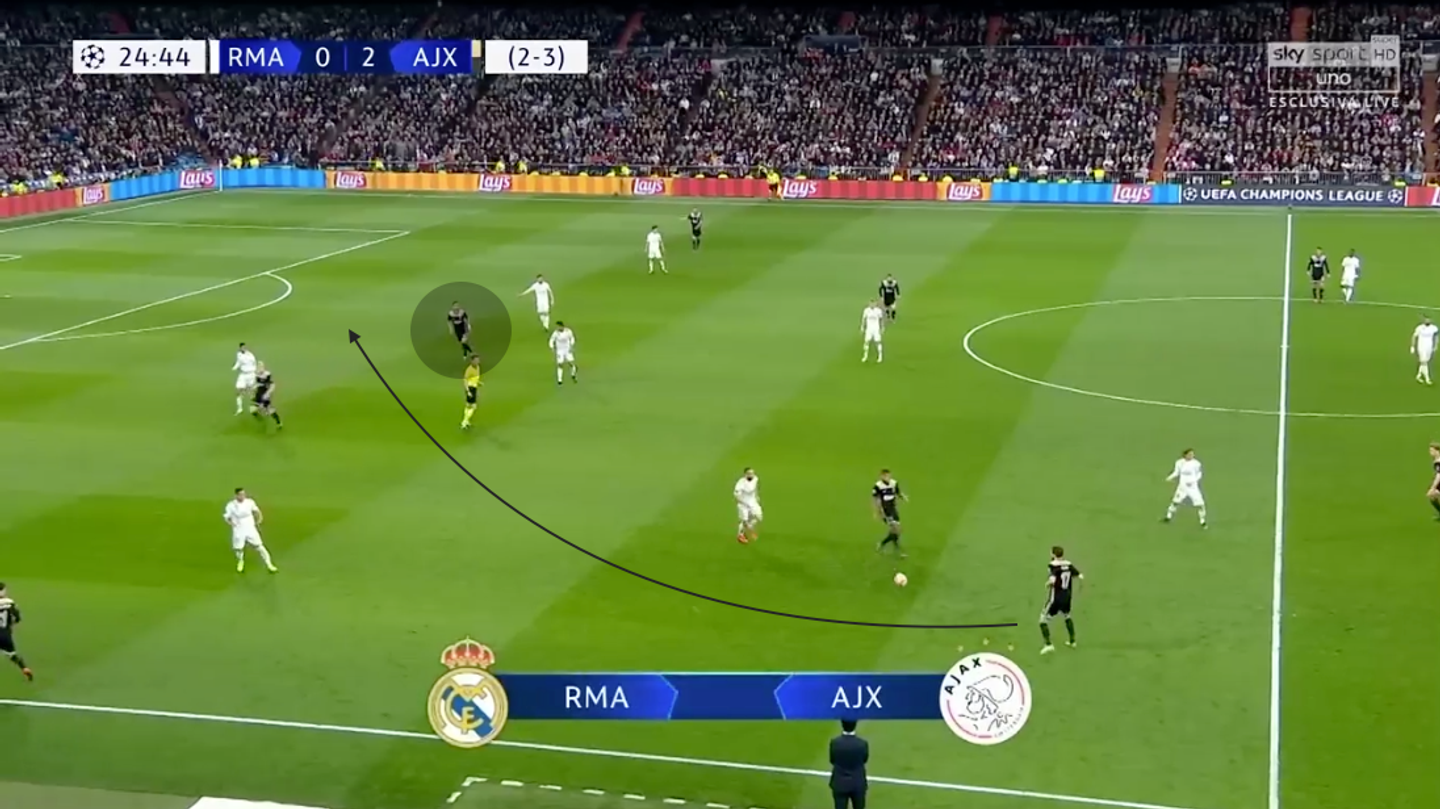 Il Real Madrid ha provato a non far giocare l’Ajax con la palla, tentando di non dare ritmo ai suoi attacchi, rinchiudendoli nella propria metà campo attraverso la riconquista veloce del pallone, ma la precisione dei movimenti senza palla e la tecnica dei centrocampisti dell’Ajax non glielo hanno permesso. De Jong ha brillato nelle due qualità che lo sintetizzano come il centrocampista più contemporaneo in Europa attualmente: la capacità di resistere alla pressione, e di far guadagnare campo alla sua squadra, superando le linee avversarie.