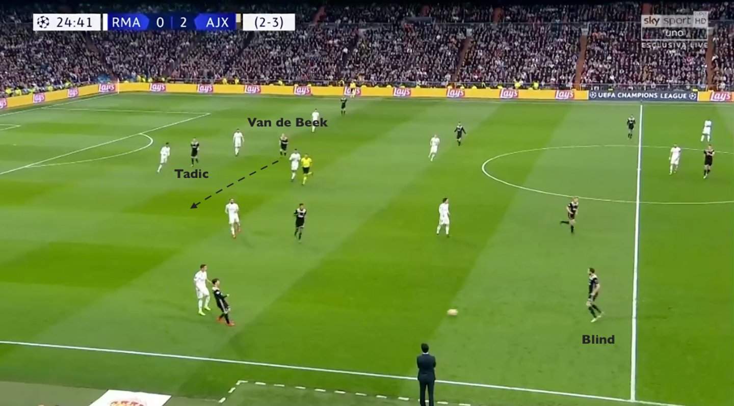 Tadic partiva nominalmente da falso nove, ma poi errava per il campo con una libertà quasi totale, manipolando le linee del Real Madrid. Si abbassava a centrocampo scambiandosi di posizione con Van de Beek (altro giocatore di grande intelligenza tattica); si spostava sulla fascia destra o sinistra, per sovraccaricare un lato o l’altro. Ieri ha creato cinque occasioni da gol, completando 15 dei 22 passaggi provati nell’ultimo quarto di campo.