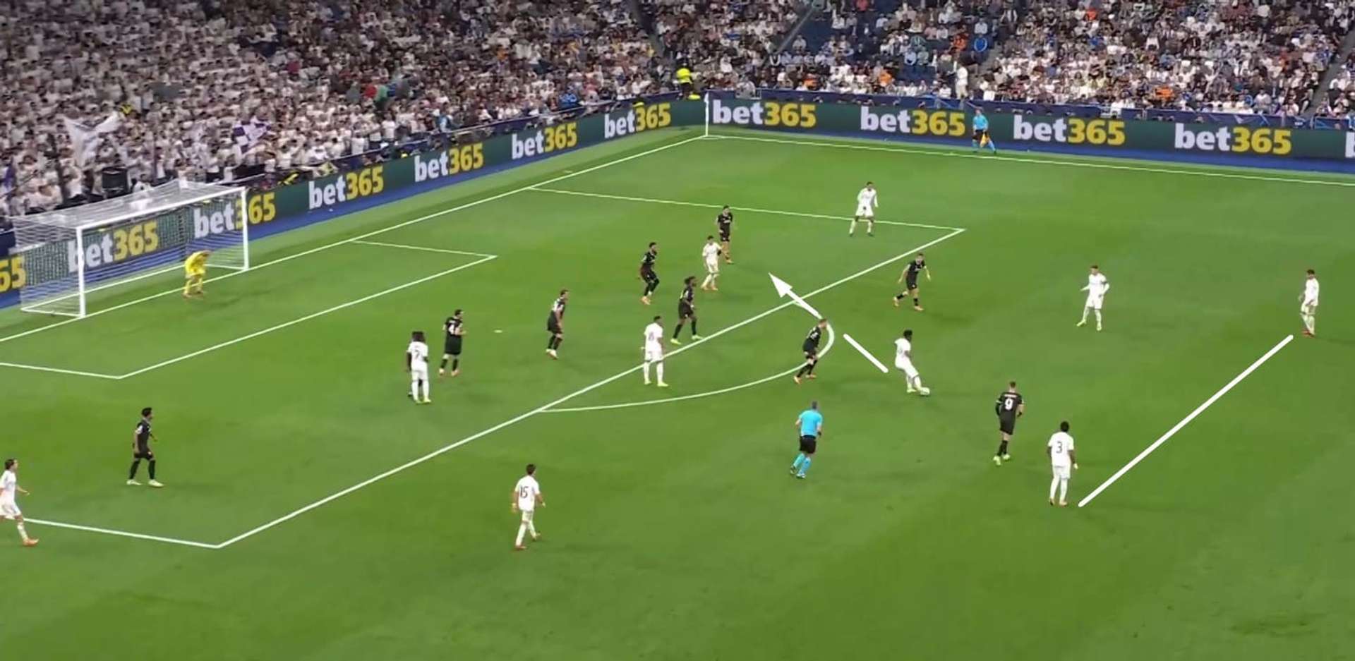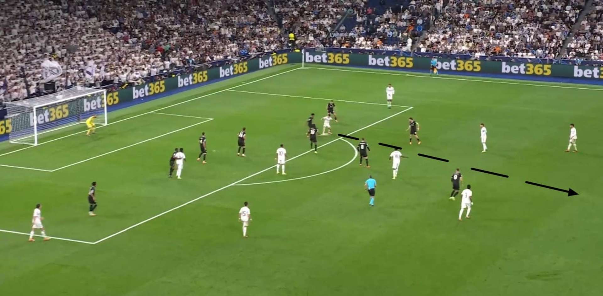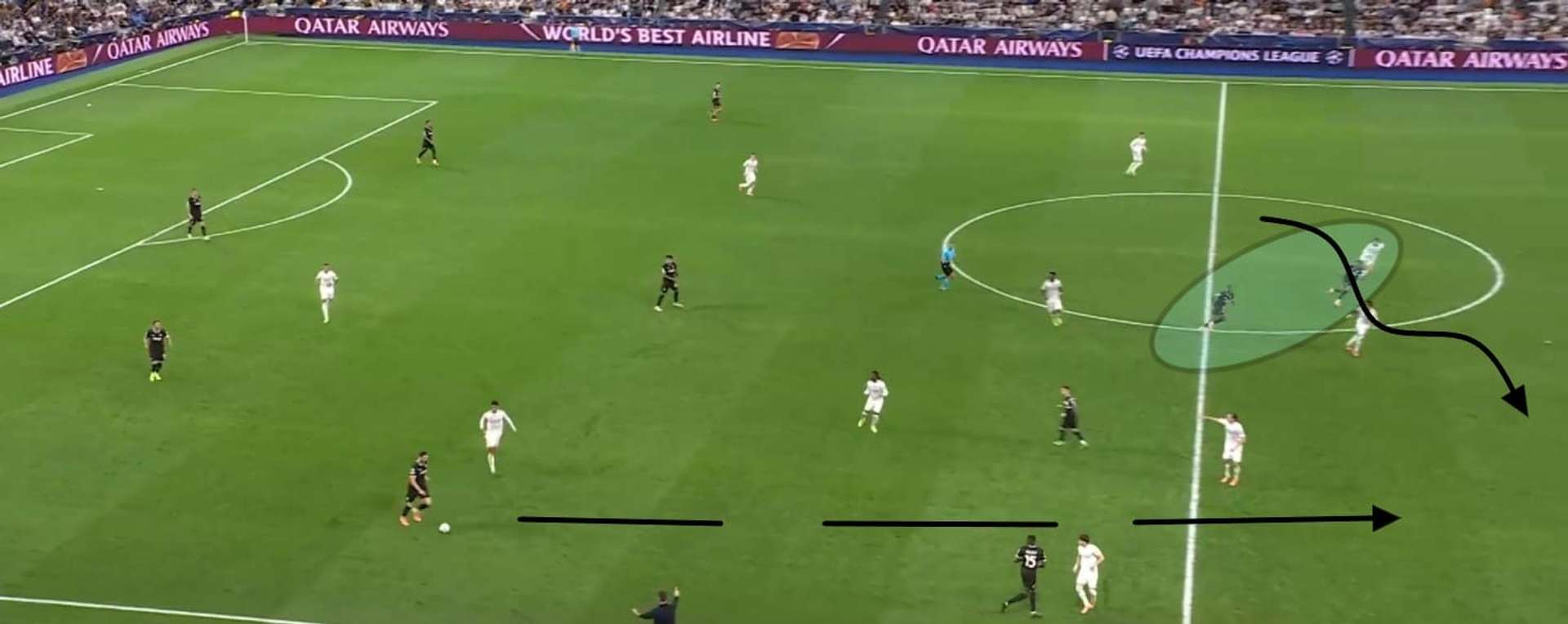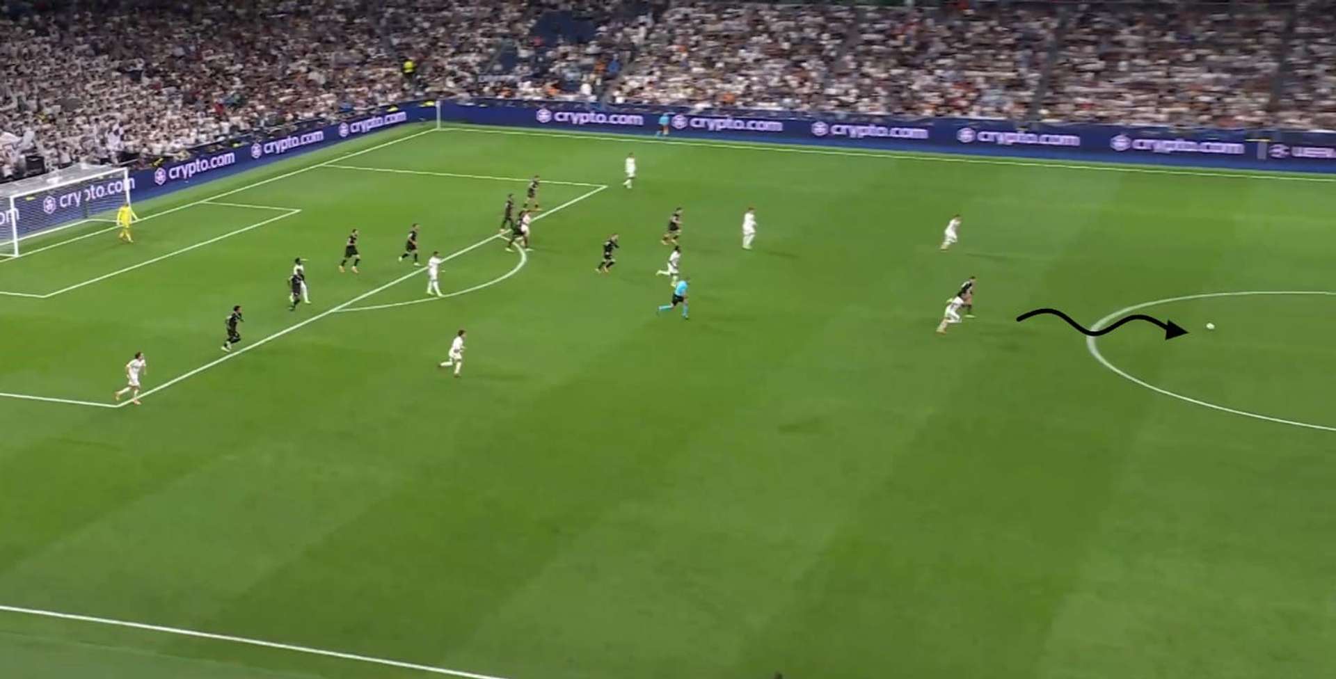 Come all’inizio del primo tempo, nei primi minuti della ripresa la Juventus è riuscita a spaventare il Real Madrid in transizione offensiva. La migliore occasione è stata quella capitata a Vlahovic al minuto 50 che è nata da un lungo rilancio dalla propria area di Lloyd Kelly e da un errore di posizionamento preventivo del Real Madrid.