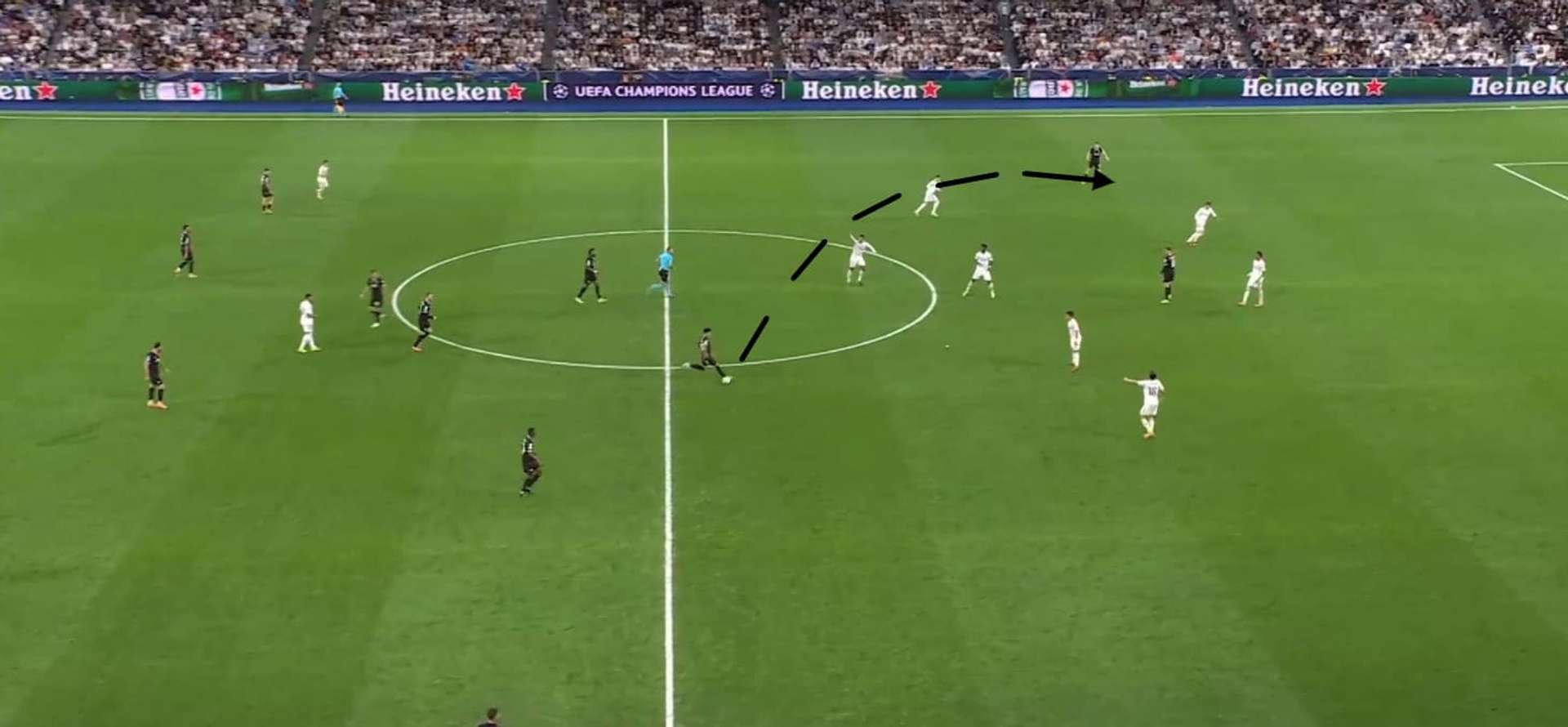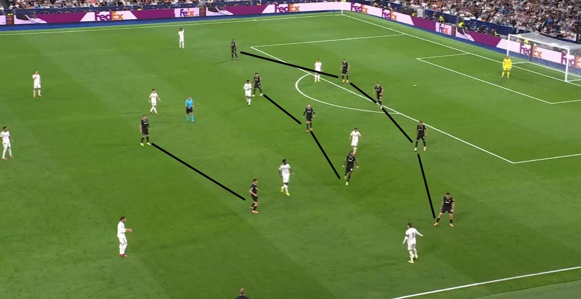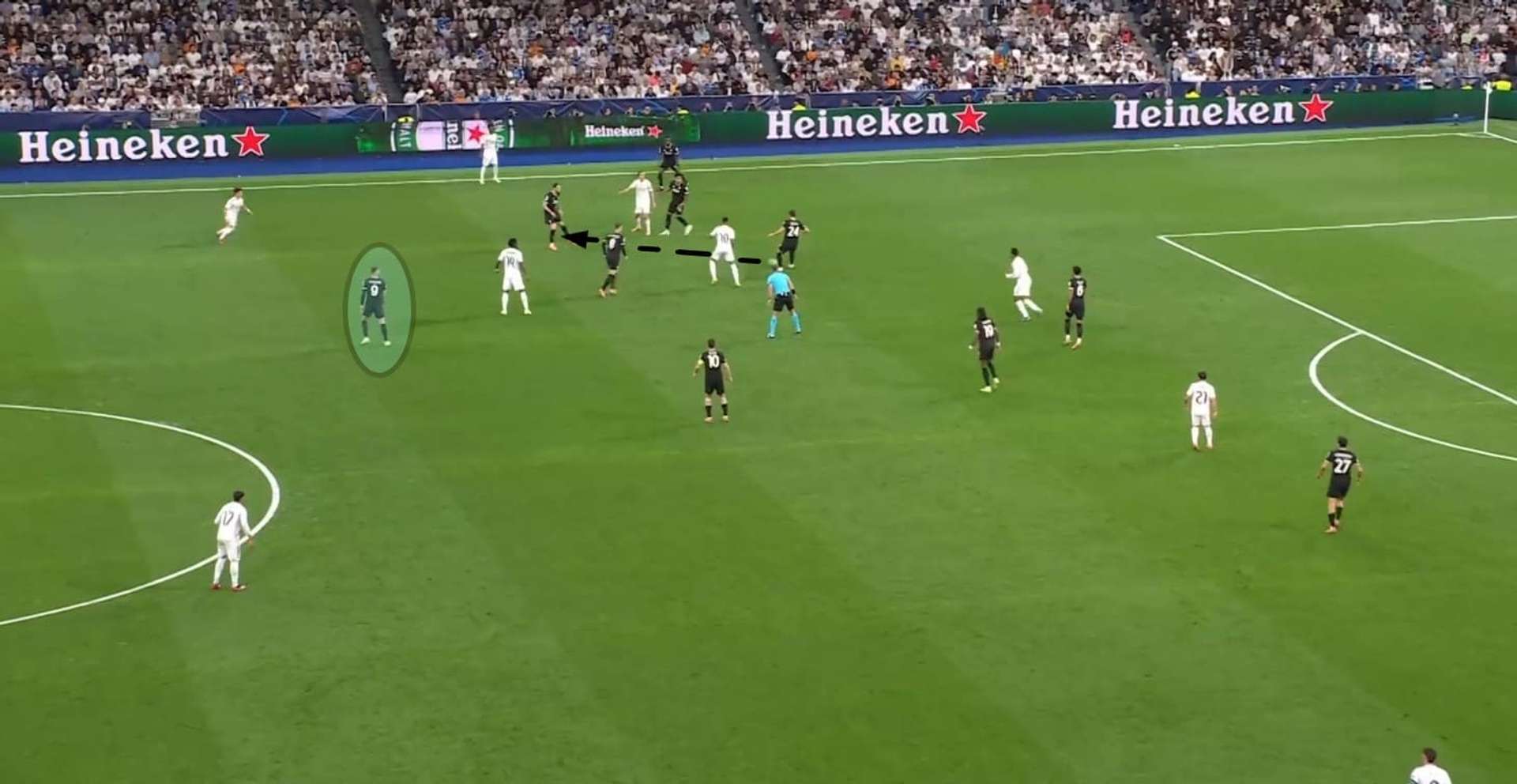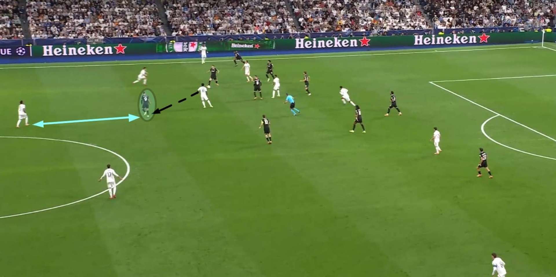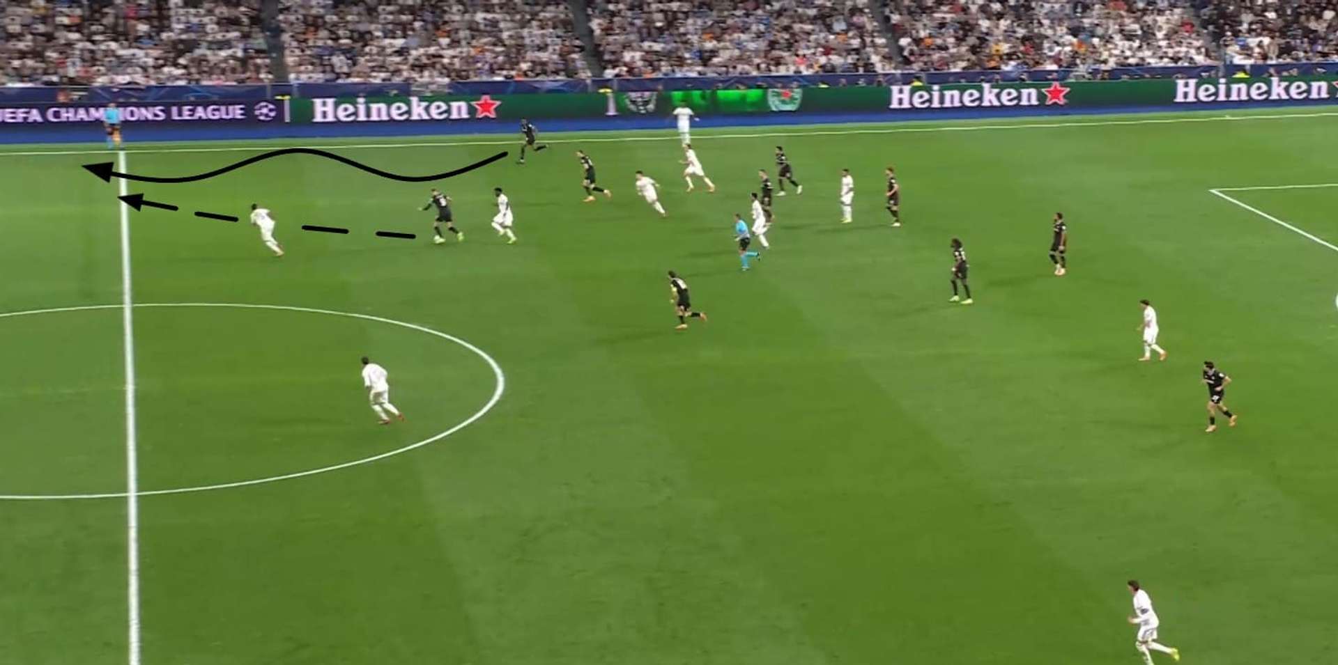 Come all’inizio del primo tempo, nei primi minuti della ripresa la Juventus è riuscita a spaventare il Real Madrid in transizione offensiva. La migliore occasione è stata quella capitata a Vlahovic al minuto 50 che è nata da un lungo rilancio dalla propria area di Lloyd Kelly e da un errore di posizionamento preventivo del Real Madrid.