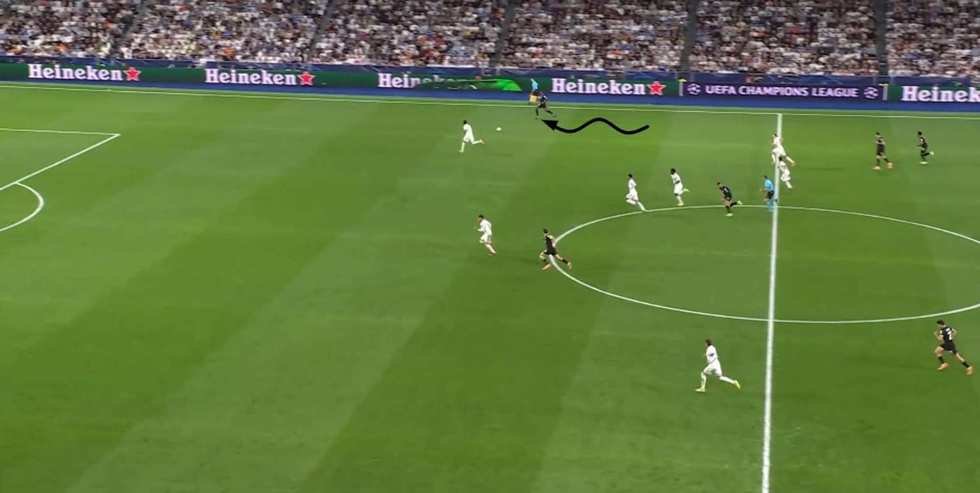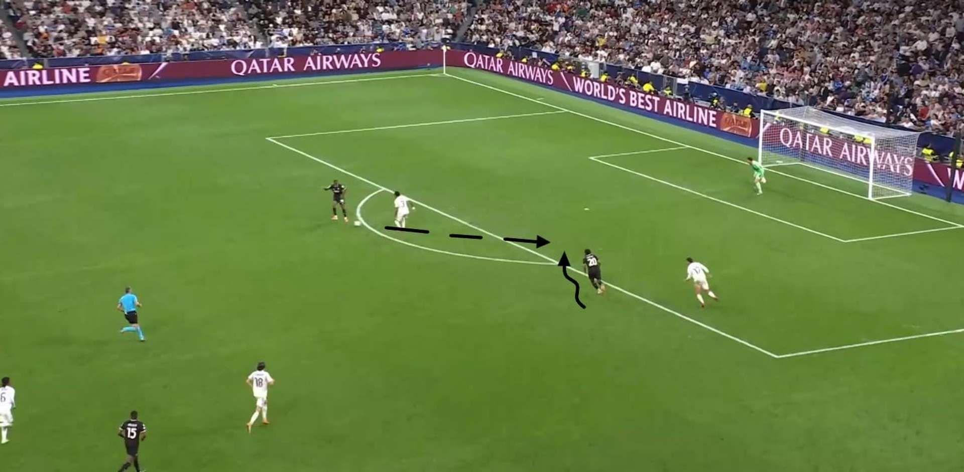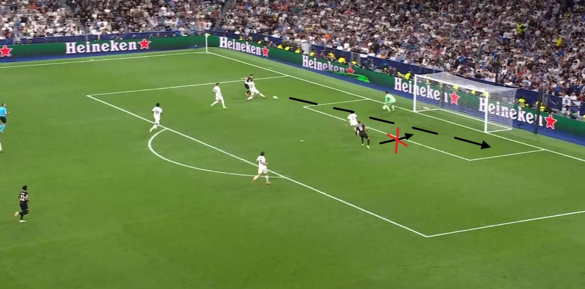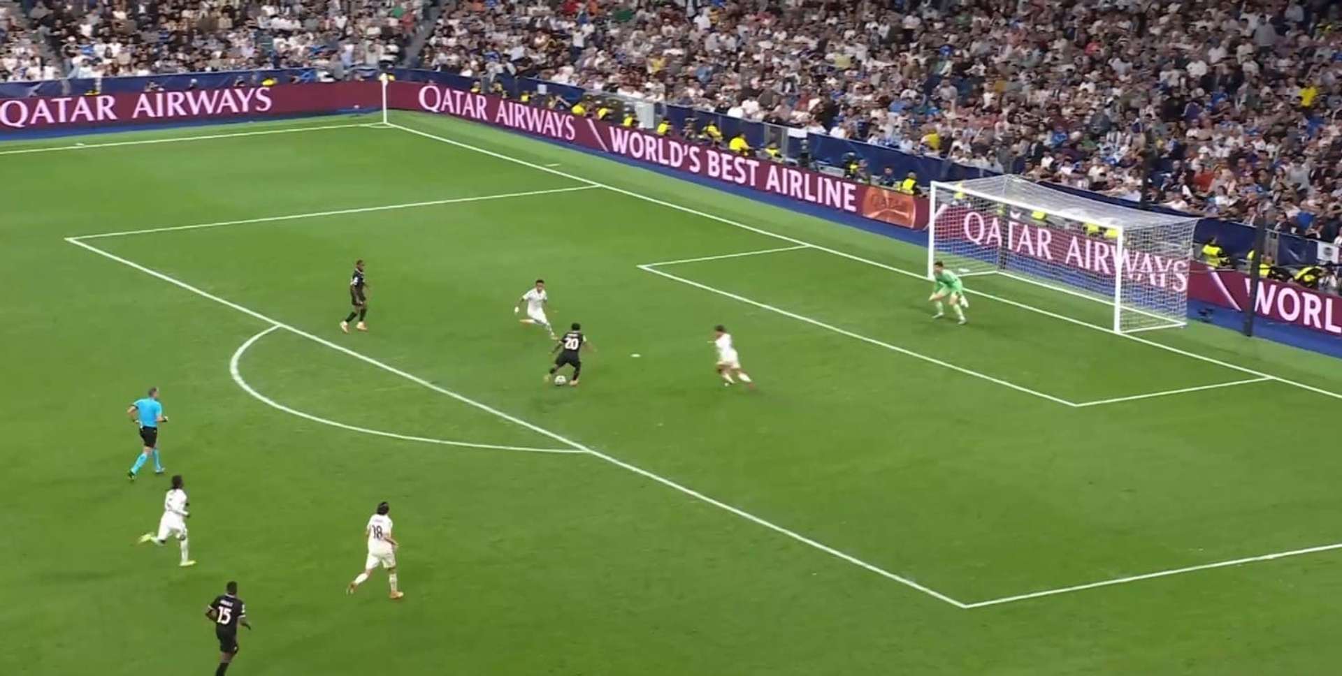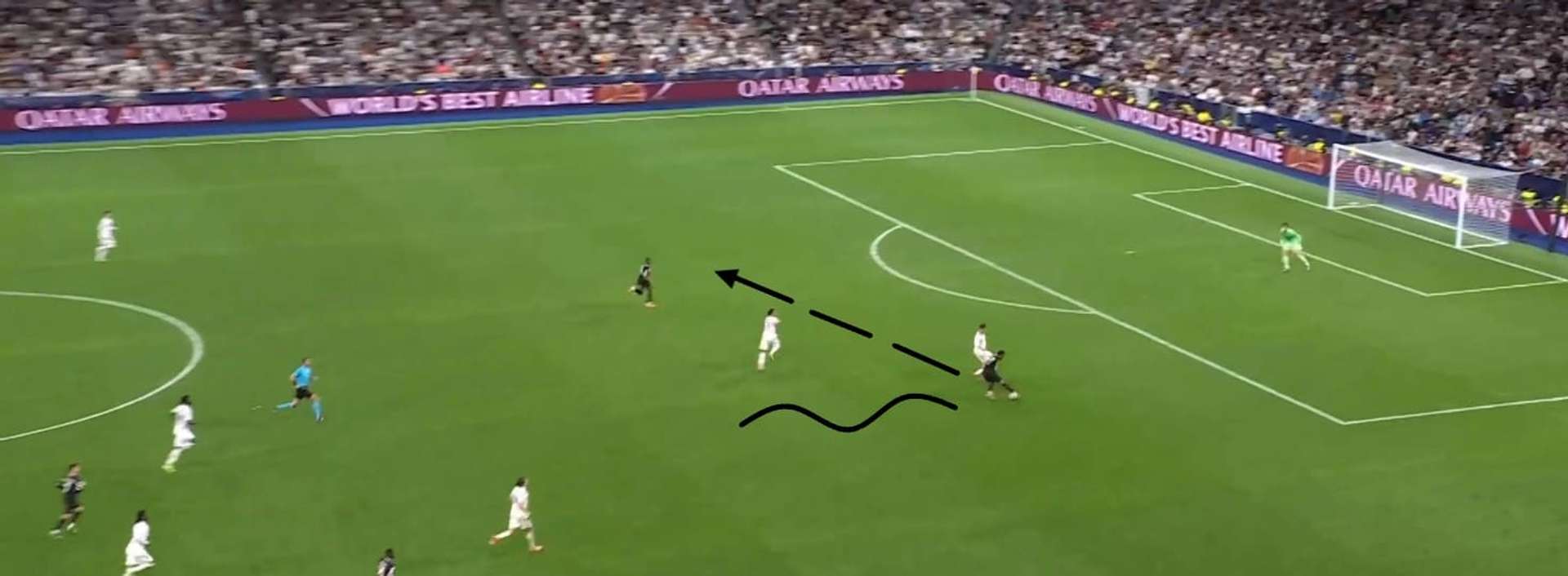 Una delle tante scelte sbagliate in fase d’attacco della Juventus. McKennie trova Yildiz libero sulla fascia sinistra, con la difesa del Real Madrid piazzata male. Yildiz punta Asencio e di sinistro effettua un formidabile cross rasoterra esattamente nello spazio indifendibile tra Militão e Courtois. Vlahovic non attacca lo spazio, rimane alle spalle di Militão, e il cross attraversa tutta l’area piccola senza essere spinto in porta dal centravanti bianconero. Sul ribaltamento di fronte il Real Madrid andrà in vantaggio.