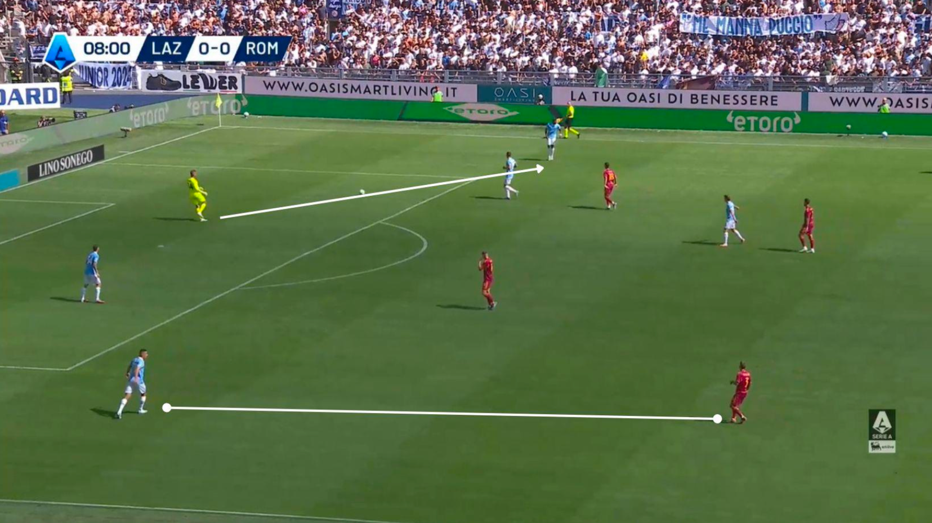 Alcuni pericoli, come il gol subito da Kean nell’ultima giornata o l’occasione di Dia nel derby, sono scaturiti da anticipi difensivi non consolidati successivamente. Nel caso di Fiorentina-Roma c’è stato l’incidente tra Mancini e Çelik che ha aperto alla transizione veloce sfociata nell’uno contro uno finale di Kean con Ndicka. Nel derby, invece, un altro anticipo di Mancini sul proprio riferimento è stato poi cancellato dall’imprecisione tecnica nel recupero del pallone: a quel punto, per la Lazio il corridoio centrale è parso in discesa con Çelik e Ndicka che potevano solo inseguire.