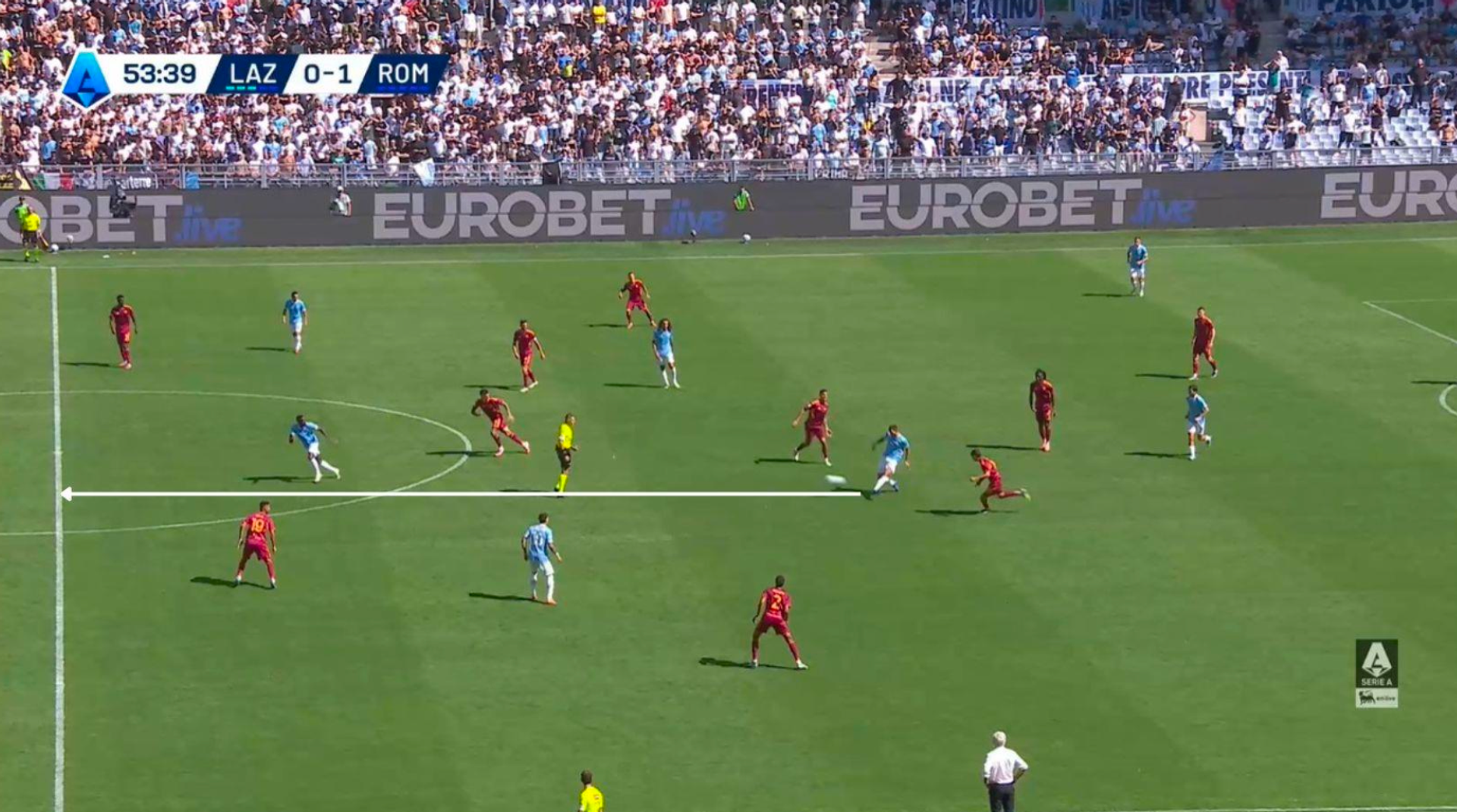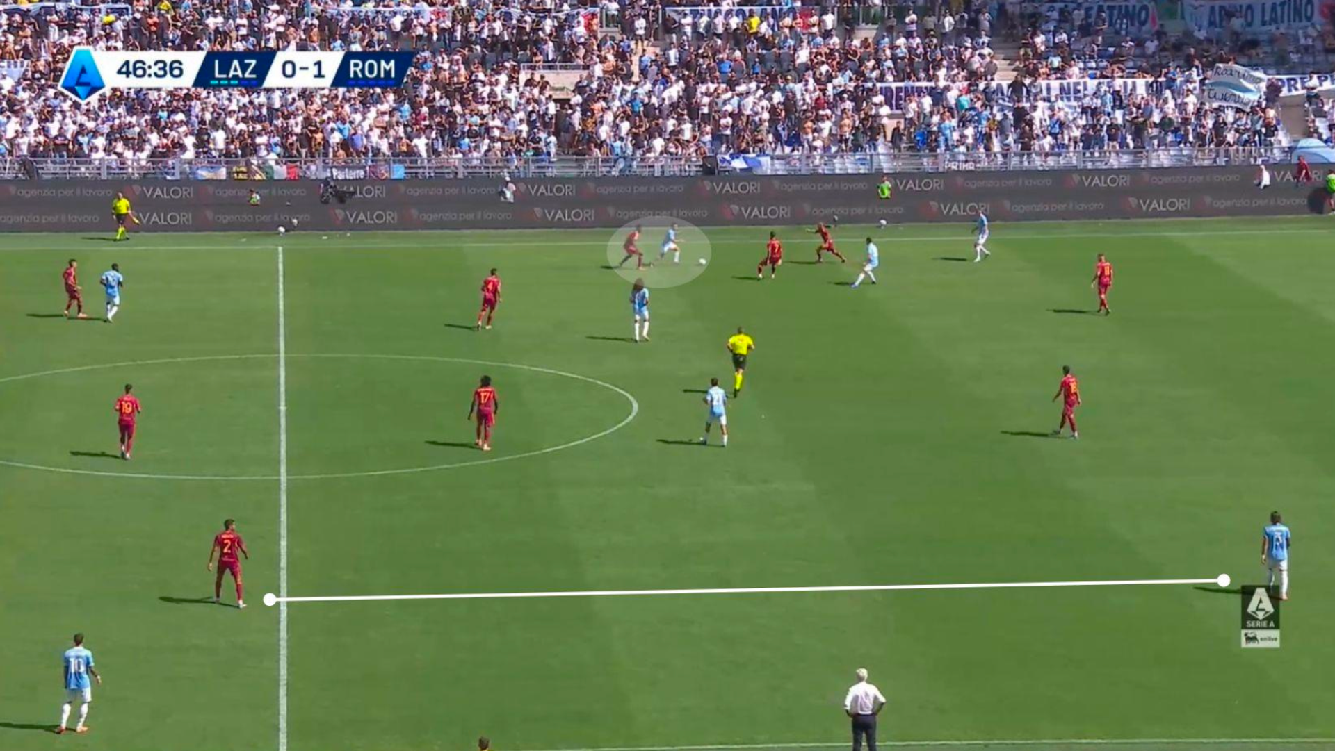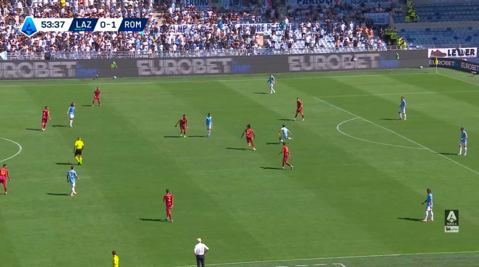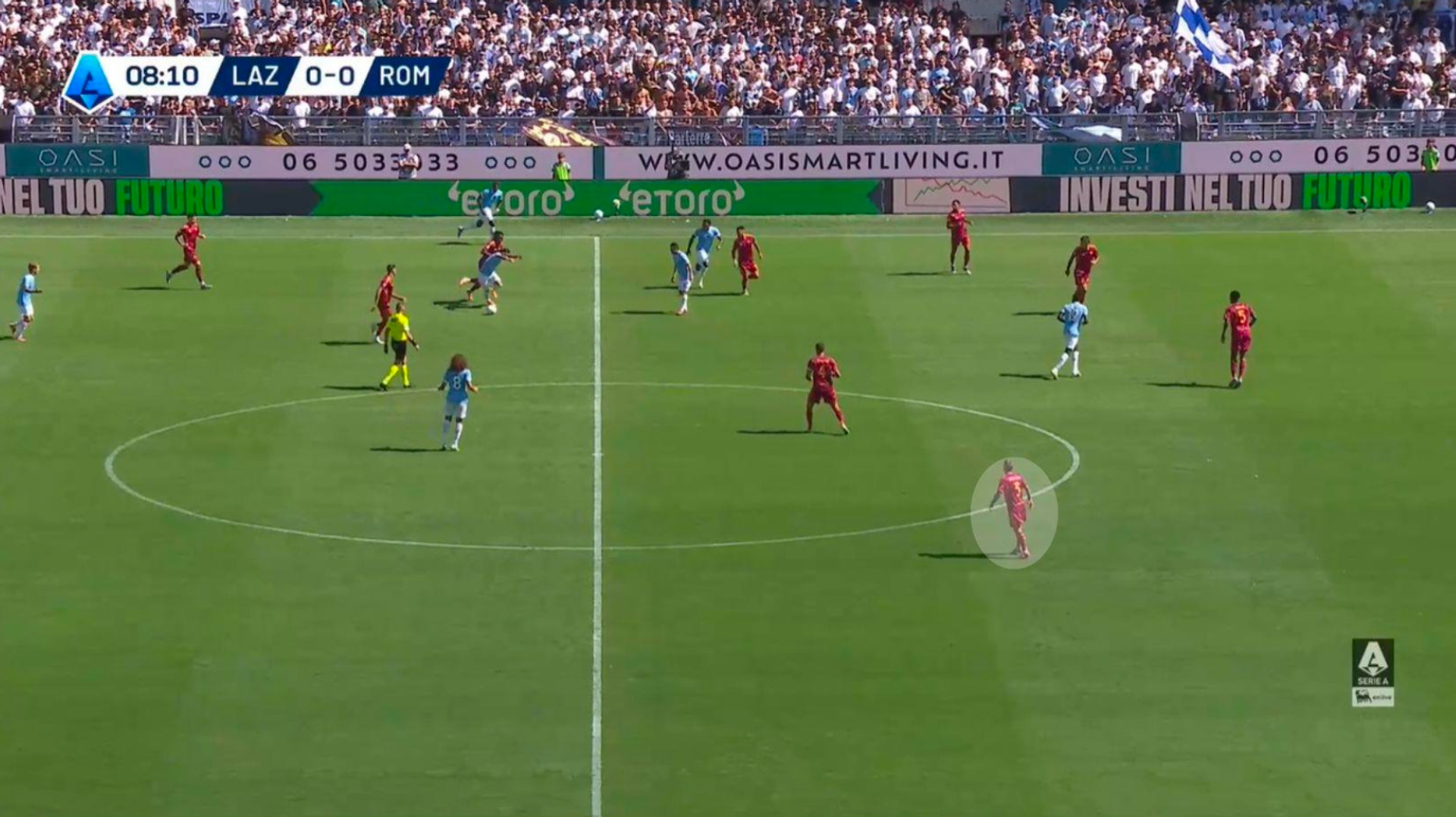 Un’altra istantanea del derby ci permette di apprezzare altri dettagli, più appartenenti alla sfera della tattica individuale, necessari a poter rendere efficace un sistema difensivo con riferimenti sull’uomo. Si vedono infatti Mancini e Ndicka marcare i rispettivi avversari, Dia e Pedro, all’altezza della metà campo. I due centrali della Roma, però, lo fanno con atteggiamenti diversi: Mancini, infatti, è in quella che si definisce “linea d’anticipo”, dunque in una posizione più laterale rispetto al proprio riferimento in modo da facilitare l’ingresso su un’eventuale traiettoria diretta sulla figura dell’attaccante e poterlo così anticipare. Il talento di Mancini in questo senso è noto (e infatti è il quarto difensore in Italia per numero di anticipi realizzati), mentre per Ndicka potrebbe essere una sorpresa (nonostante abbia già realizzato otto anticipi).