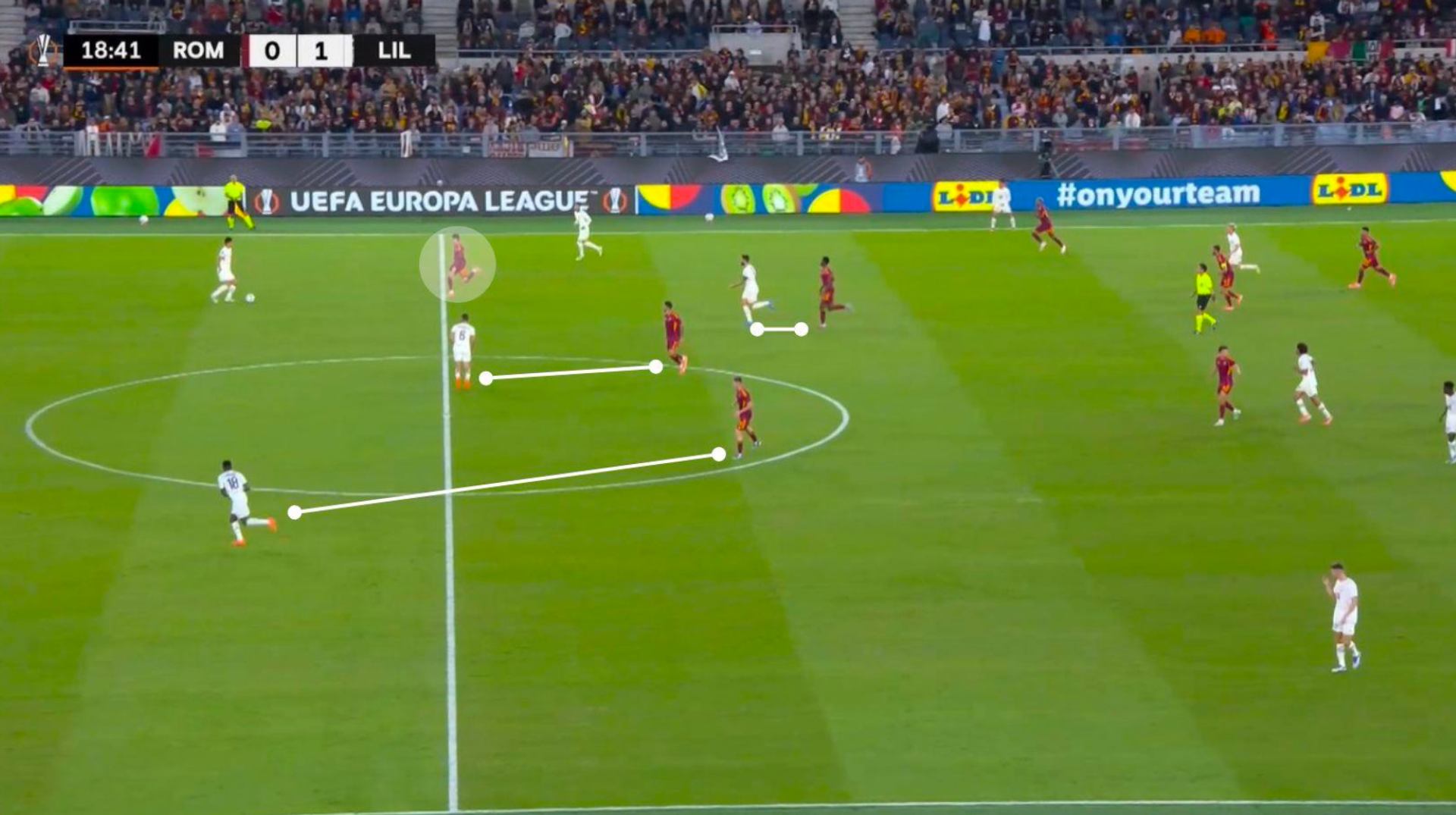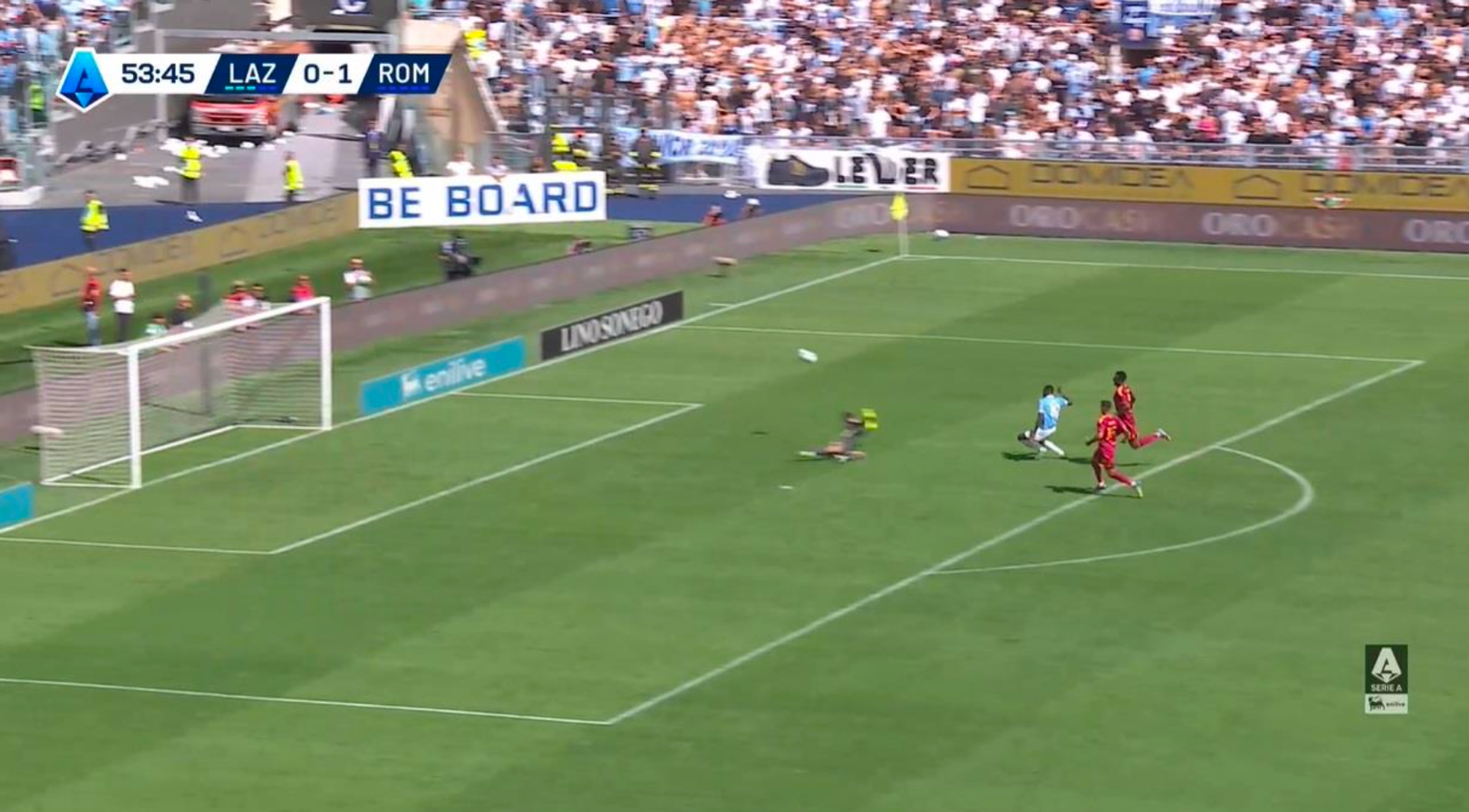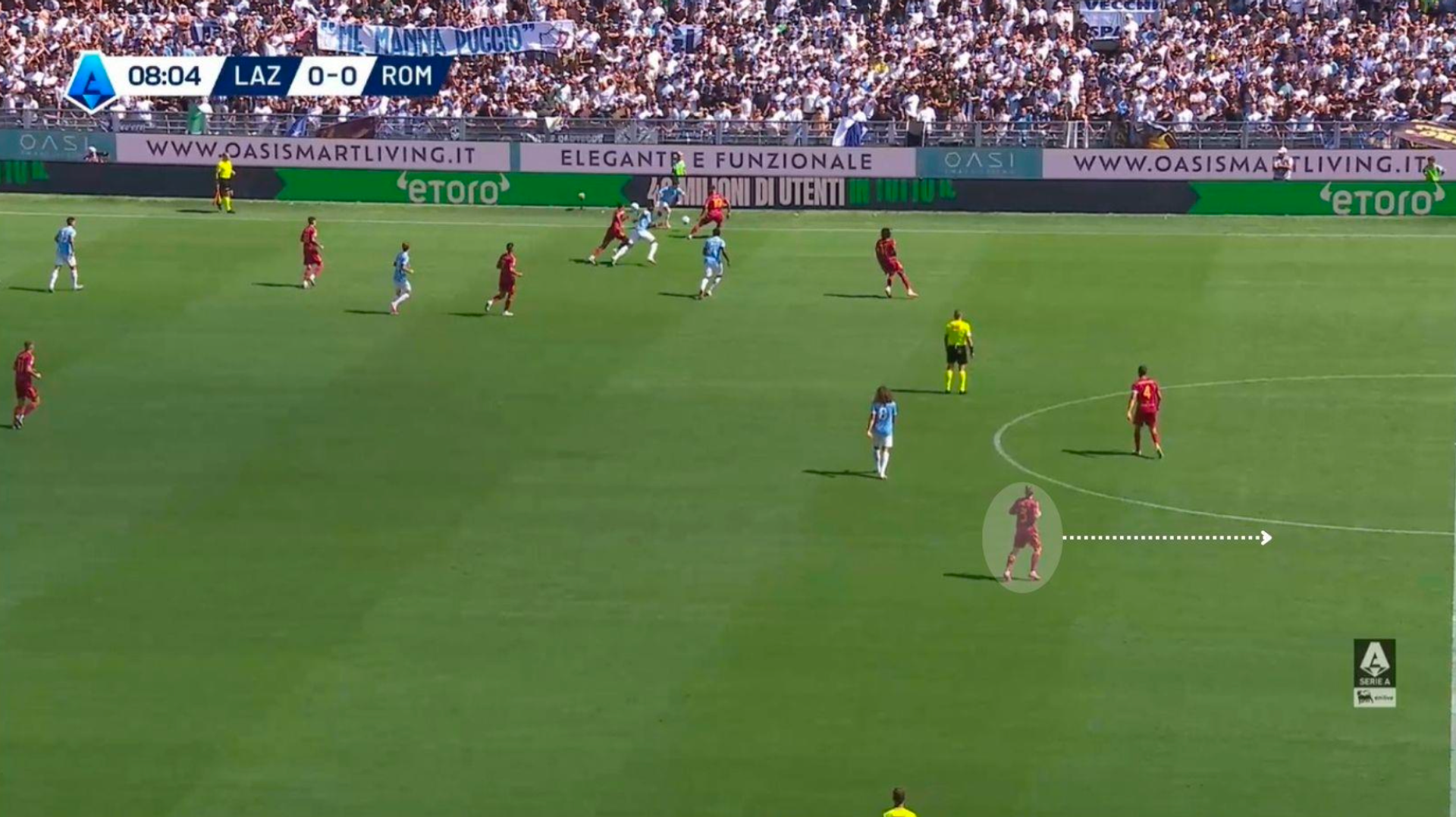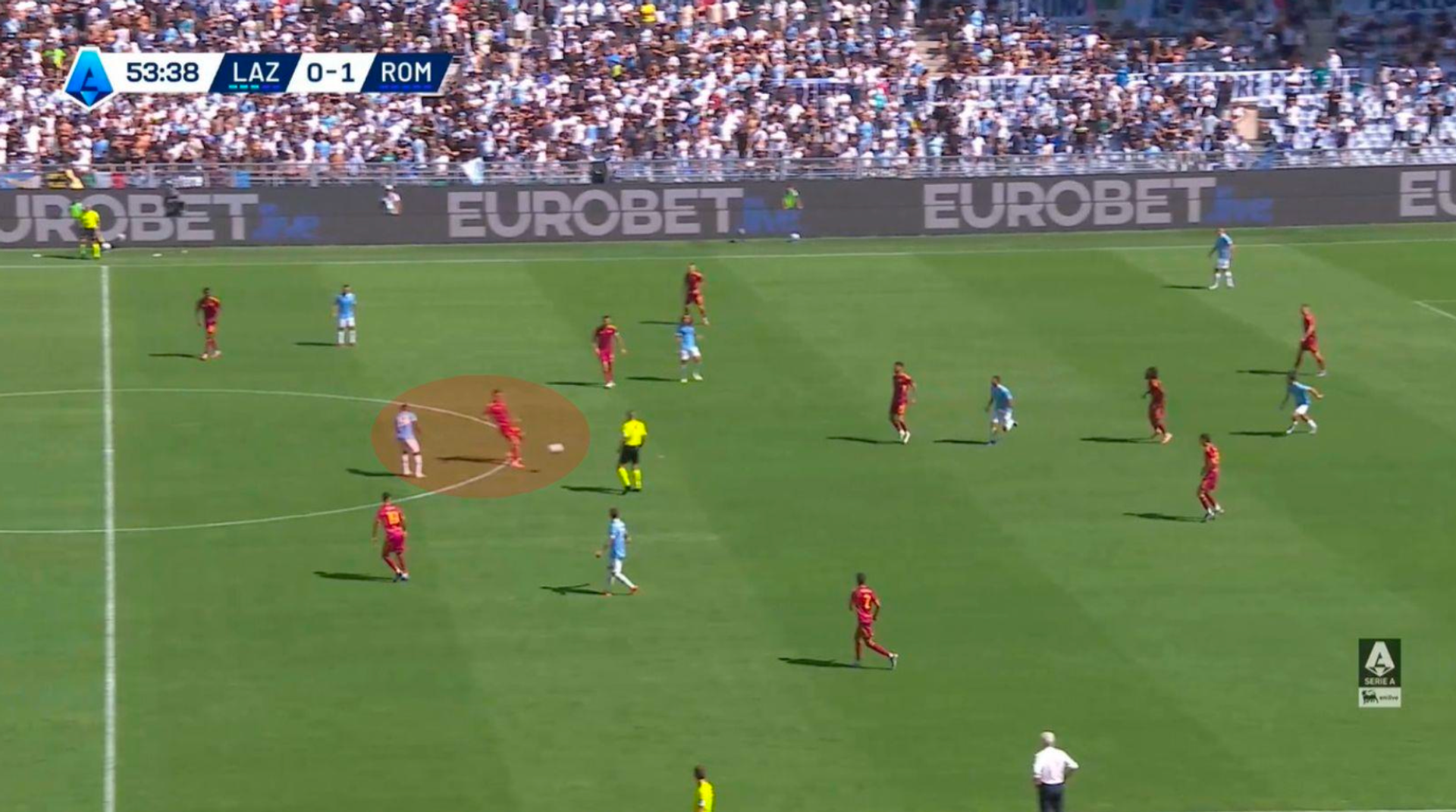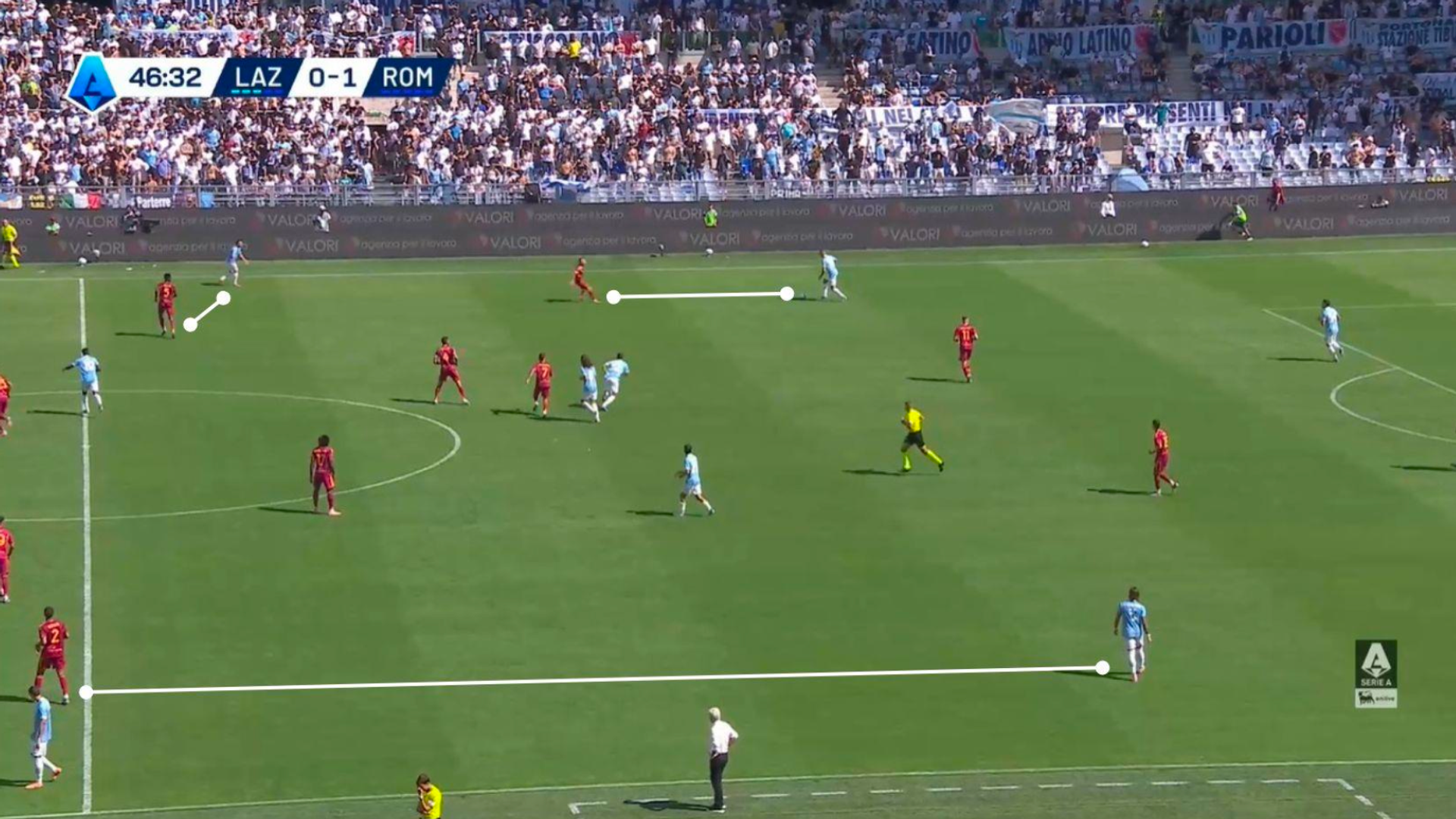 Un’altra istantanea del derby ci permette di apprezzare altri dettagli, più appartenenti alla sfera della tattica individuale, necessari a poter rendere efficace un sistema difensivo con riferimenti sull’uomo. Si vedono infatti Mancini e Ndicka marcare i rispettivi avversari, Dia e Pedro, all’altezza della metà campo. I due centrali della Roma, però, lo fanno con atteggiamenti diversi: Mancini, infatti, è in quella che si definisce “linea d’anticipo”, dunque in una posizione più laterale rispetto al proprio riferimento in modo da facilitare l’ingresso su un’eventuale traiettoria diretta sulla figura dell’attaccante e poterlo così anticipare. Il talento di Mancini in questo senso è noto (e infatti è il quarto difensore in Italia per numero di anticipi realizzati), mentre per Ndicka potrebbe essere una sorpresa (nonostante abbia già realizzato otto anticipi).