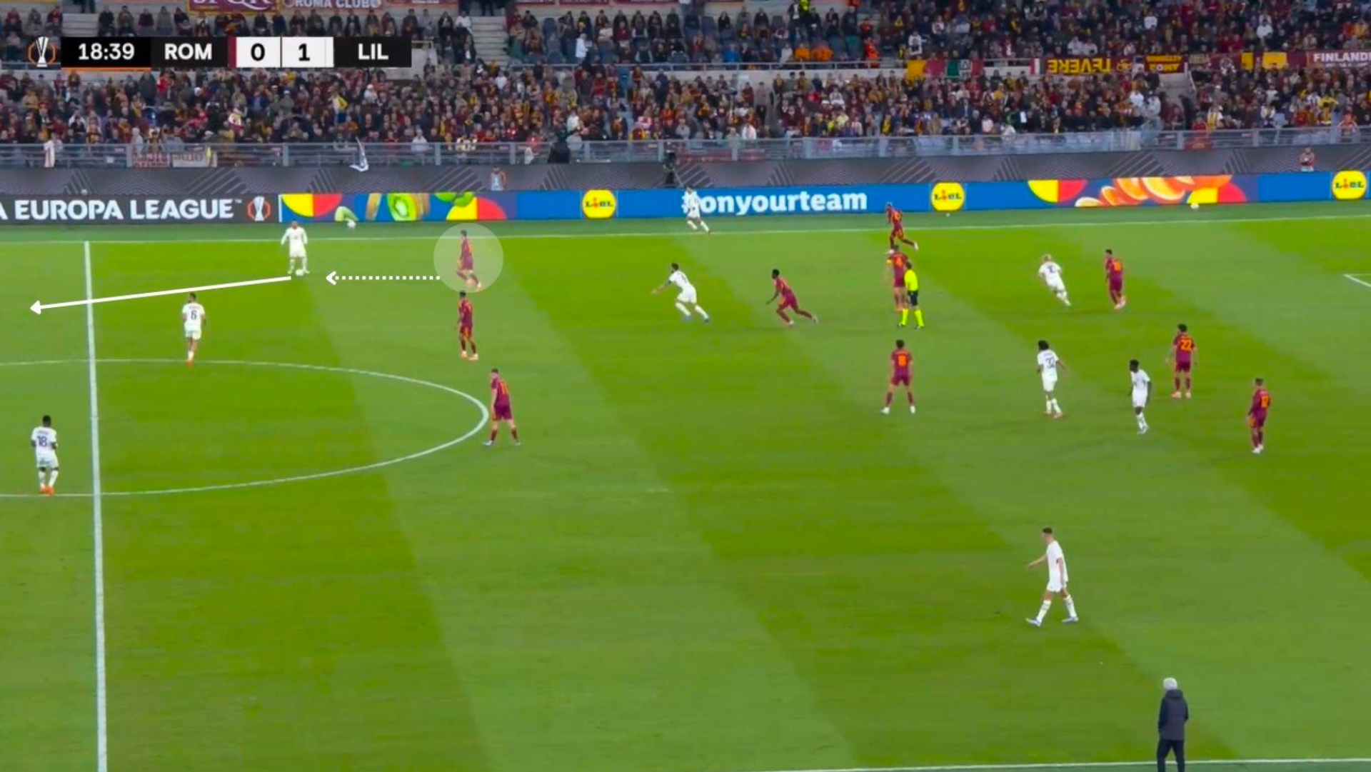 Nelle prime pressioni in ampiezza, sulla costruzione avversaria, spesso la Roma, come succedeva anche all’Atalanta con Gasperini, concede maggiori tempi di gioco all’avversario, allentando la presa sull’avversario di riferimento. Lo stesso discorso si ripete, come si vede qui sotto, a sinistra con Angeliño, che inizialmente allenta la pressione su Marusić, pronto ad accorciarlo qualora ricevesse un passaggio.