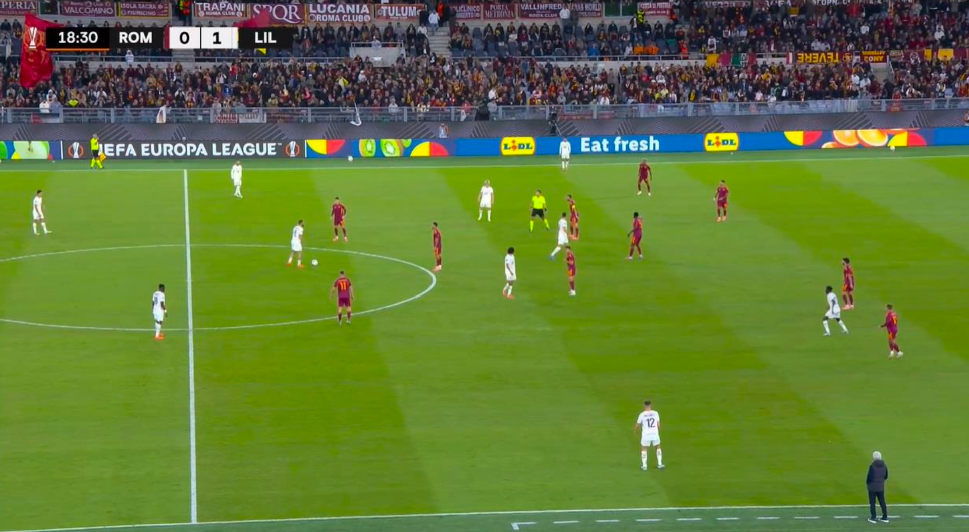 Quando la squadra di Gasperini è costretta ad una difesa posizionale pare quasi scalciare: abbassa tutti i propri riferimenti sotto la linea del pallone per poi scattare fuori dai blocchi su un passaggio indietro degli avversari e andare nuovamente ad alzare i voltaggi della pressione, prima sul pallone, poi sui vari riferimenti. Si è visto più marcatamente contro il Lille, in Europa League, la squadra che fin qui è riuscita a contendere maggiormente il possesso del pallone alla Roma (50-50 il bilancio finale) e che più è riuscita ad aggirare la pressione dei giallorossi.
