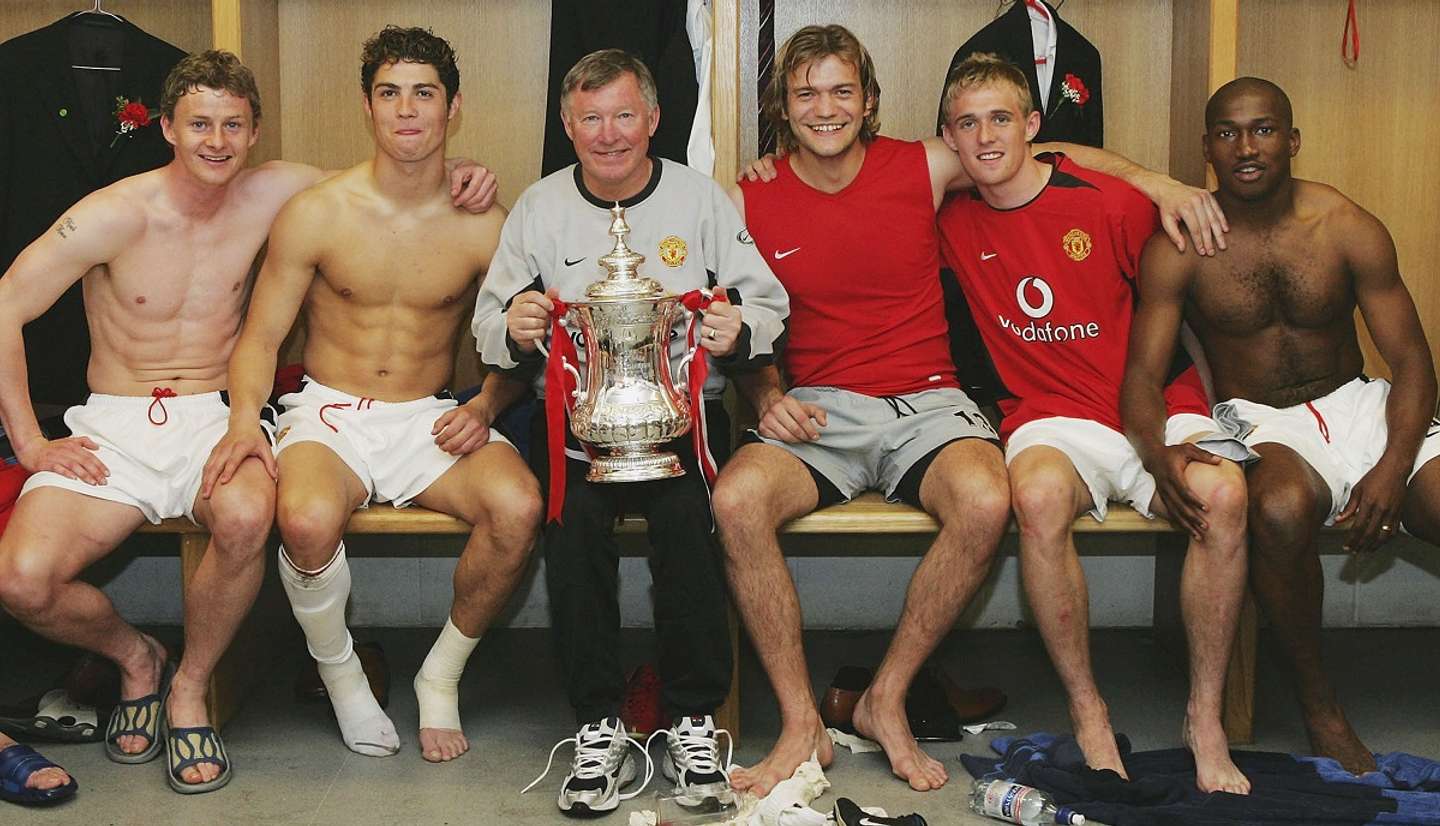 Dopo la finale di FA Cup vinta il 22 maggio 2004. Da sinistra: lui, Cristiano Ronaldo, Ferguson, Carroll, Fletcher e Djemba-Djemba (foto di John Peters/Manchester United via Getty Images).