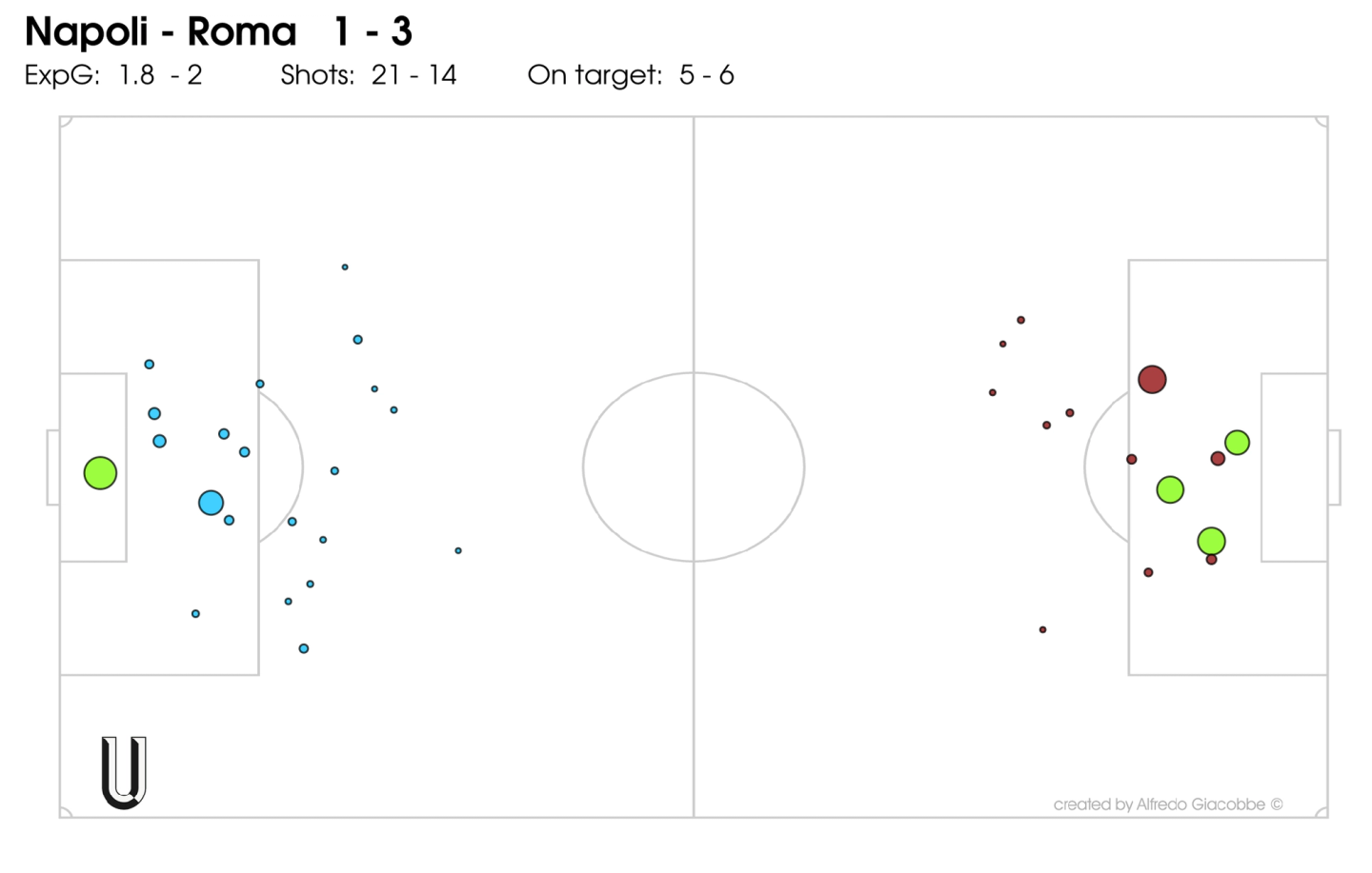 Nel primo tempo il Napoli è arrivato alla conclusione in porta dall’interno dell’area di rigore in una sola occasione, su un’incursione solitaria palla al piede di Allan; per il resto, se si esclude un’altro inserimento di Callejon su una rarissima combinazione tra Allan (dall’esterno) e Gabbiadini a fare la sponda, gli azzurri si sono affidati a tiri dalla distanza poco pericolosi (per dirla coi numeri: l’xG medio di ogni tiro del Napoli è di 0,09, mentre xG medio della Roma è 0,14).