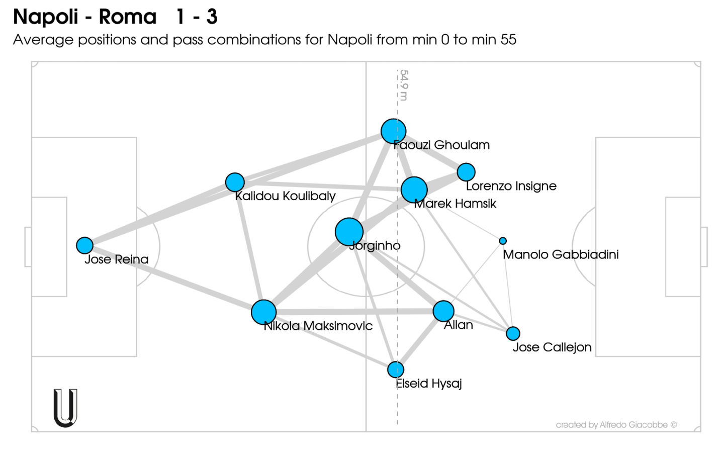 Quando i difensori eseguivano bene la giocata tecnica (soprattutto Manolas è stato sorprendente da questo punto di vista, eludendo spesso la pressione di Insigne per trovare un uomo in avanti), i centrocampisti di Spalletti ruotavano in posizioni tali da farsi trovare liberi, creando combinazioni di passaggio efficaci.