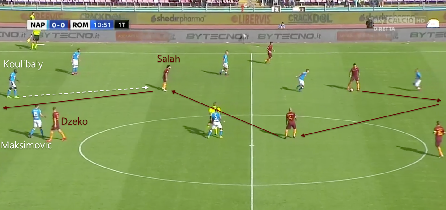 Nell’immagine sopra Salah entra nel campo alle spalle di Jorginho, che si fa attirare dal pallone. Paredes, con l’aiuto di Fazio, trova Nainggolan che si è spostato verso il basso a sua volta in una posizione intermedia tra la mezzala e il regista avversari. Con 4 passaggi, il pallone arriva sulla corsa di Dzeko in campo aperto, servito di prima da Salah, con Maksimovic lasciato nell’uno contro uno dall’uscita tardiva di Koulibaly sull’egiziano.