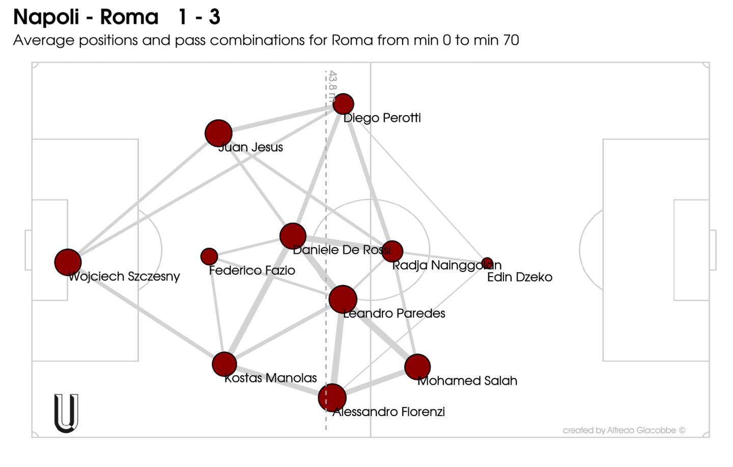 Altre volte, Nainggolan e Salah hanno scambiato la loro posizione, con l’egiziano più basso e il belga nella mezza posizione tra la mezzala e il terzino del Napoli. E ancora, in altre occasioni, era Florenzi il terminale intermedio della serie di scambi che provava a mettere uno degli attaccanti in porta. La Roma è riuscita ogni volta a far scorrere il pallone piazzando un uomo nei rivoli degli spazi intermedi delle maglie dello schieramento avversario.