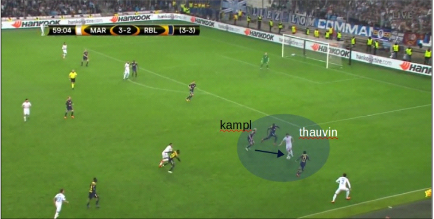 Facciamo un esempio: il gol del momentaneo 4-2 contro il RB Lipsia. Nei nostri occhi è rimasta la scioltezza con cui Payet ha lasciato di sale il suo avversario e calciato d'esterno sotto l'incrocio. La giocata che permette all'ex West Ham di puntare la difesa tedesca nasce però dai piedi di Thauvin. Payet, che riceve in movimento un passaggio di Maxime Lopez, per anticipare l'uscita di Augustin appoggia in avanti su Thauvin spalle alla porta, circondato da tre avversari pronti ad aggredirlo: Upamecano da dietro, defilato sulla sua destra, Kampl e Bruma davanti a lui, il primo alla sua sinistra, il secondo alla sua destra. La palla non viaggia precisa sui piedi di Thauvin, gli arriva leggermente a sinistra. Compie un piccolo movimento laterale verso il pallone e poi chiude il sinistro per orientare il primo tocco all'indietro e scoprire la palla, senza tenerla sotto il corpo. In questo modo la sfera viaggia in direzione opposta alla corsa di Kampl e Bruma e rende inutile il movimento orizzontale di Upamecano alle spalle. Ma Thauvin non solo evita l'intervento avversario: la corsa diagonale di Kampl ha scoperto la linea di passaggio per il movimento di Payet verso l'area. Thauvin chiude un'altra volta il piatto, stavolta per servire il capitano che si trova in isolamento con Ilsanker.