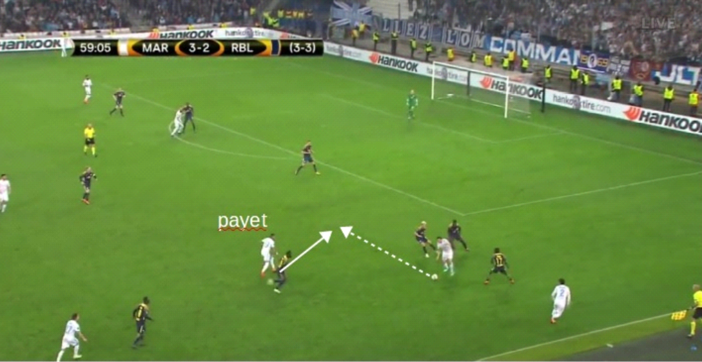 Se proprio non c’è lo spazio per tentare il dribbling, allora può decidere di coinvolgere in costruzione i compagni e sfruttarli come parete per proseguire la propria azione palla al piede. Nelle combinazioni sullo stretto emerge peraltro una certa confidenza negli appoggi di prima, anche spalle alla porta. In questo senso l’efficacia e la precisione del suo gioco di sponda si moltiplica se interagisce con due giocatori dal tocco sensibilissimo come Payet e Maxime Lopez.