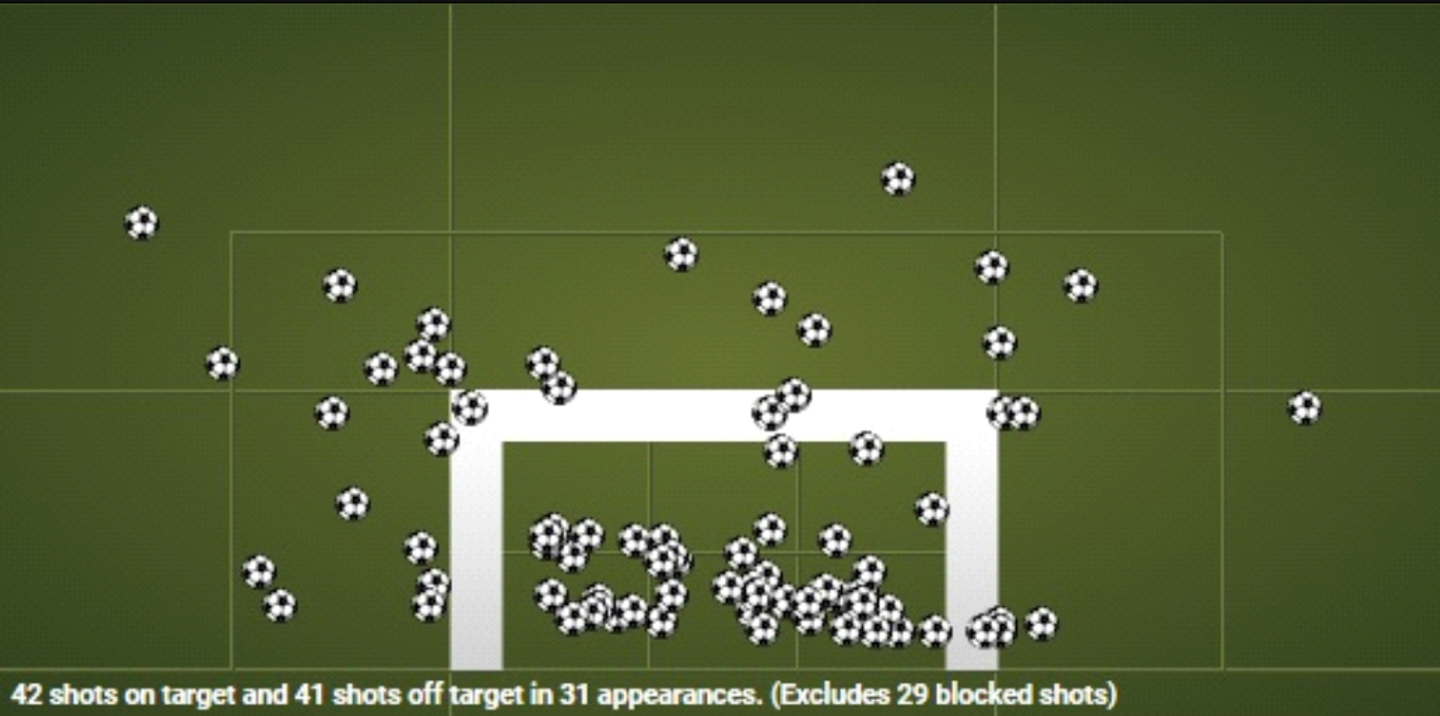 La destinazione finale dei tiri di Thauvin secondo Squawka (compresi quelli da dentro l'area). Notare i molti palloni sopra la traversa, segno di una postura non sempre perfetta al momento della conclusione.