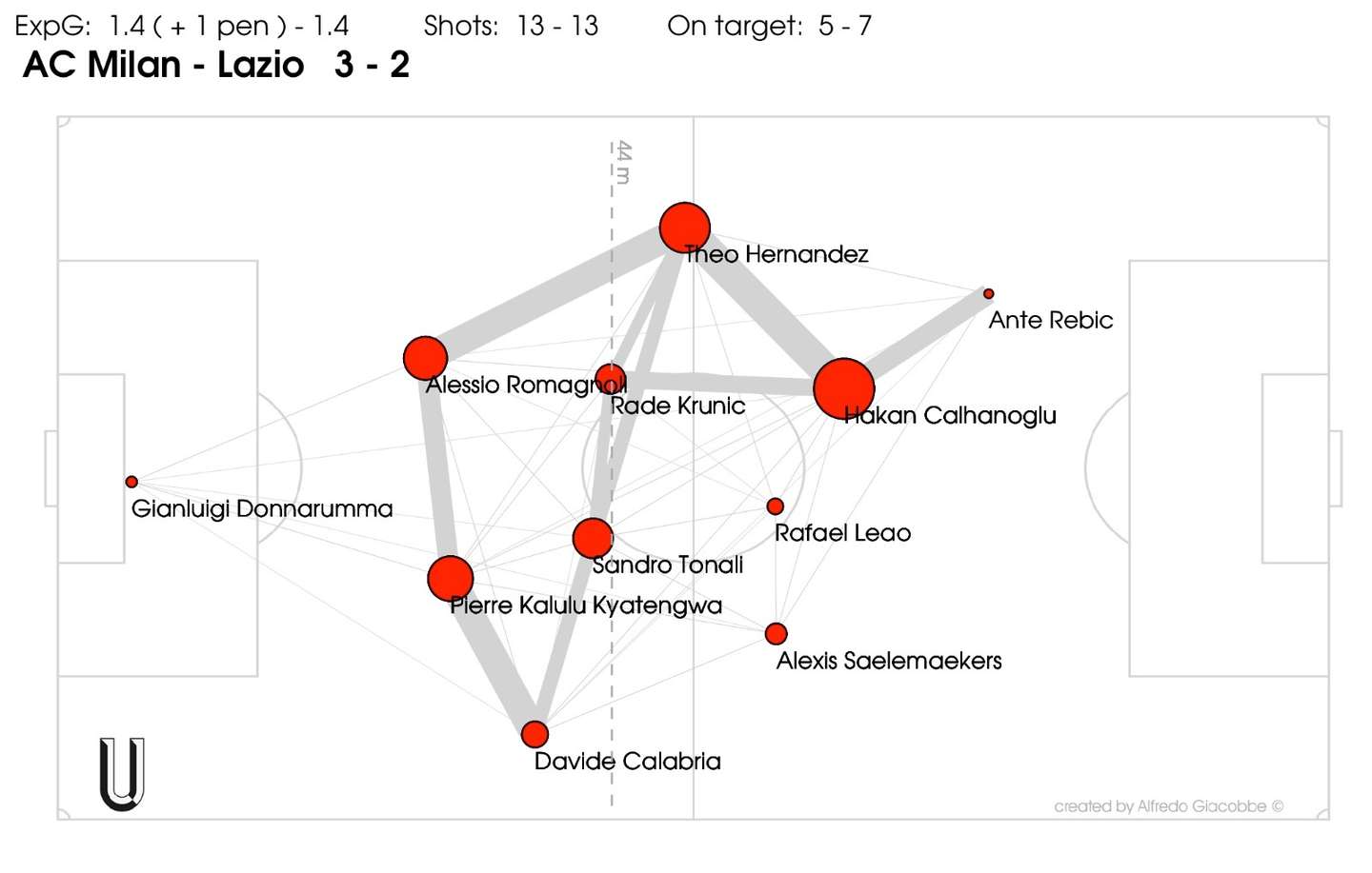 La centralità di Theo Hernandez e Calhanoglu nella pass-map rossonera.