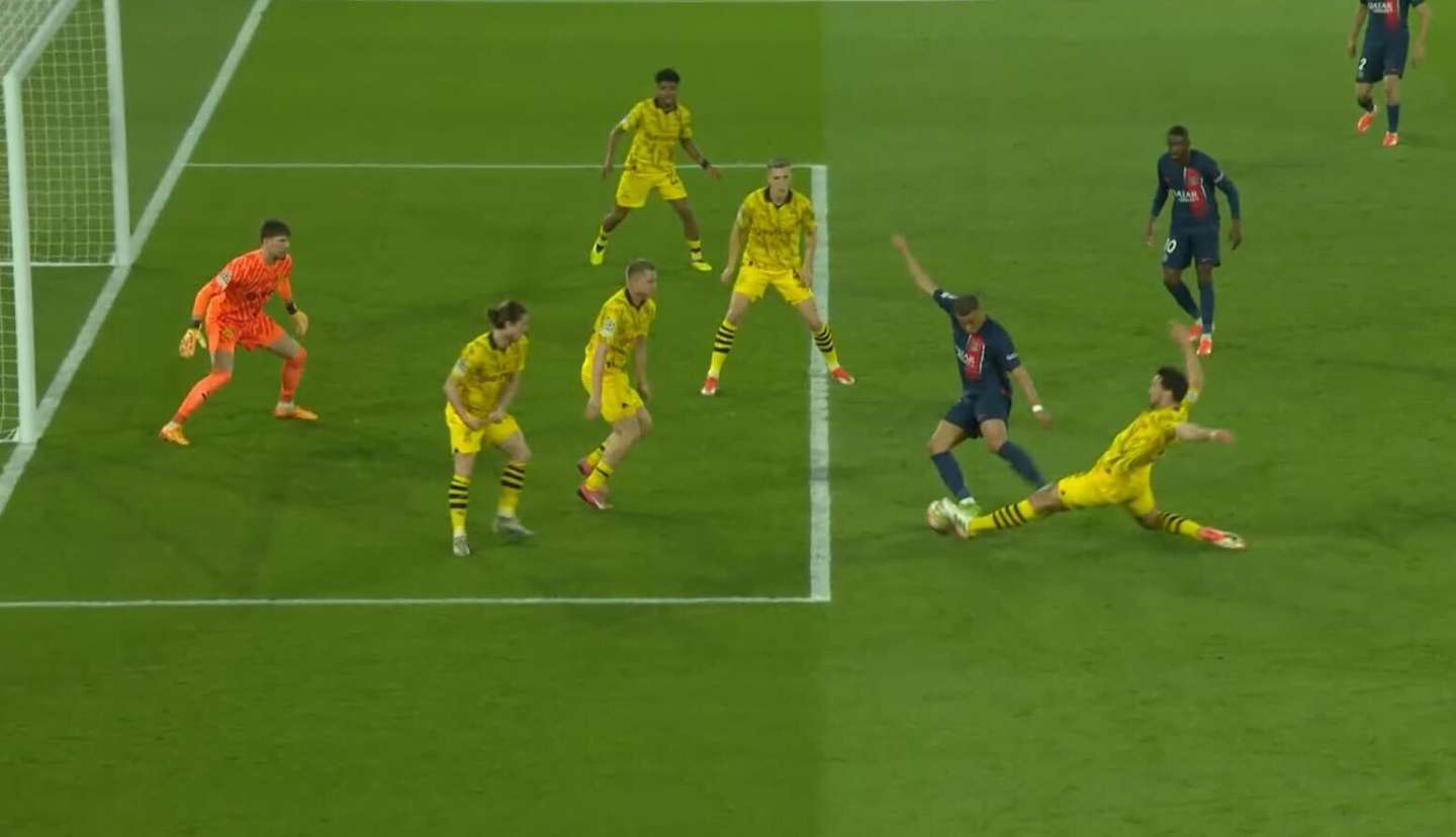 Ma per ogni sbavatura da parte di uno o più giocatori del Borussia c’era la rete di sostegno del sacrificio collettivo: Kobel compie la sua più bella parata allungandosi per deviare il tiro di Mbappé e alle sue spalle, in uno spazio di non più di quattro metri che lo separava dalla riga, c’erano cinque suoi compagni pronti a respingere la palla nel caso in cui fosse passata. Quando serve, si difende anche dietro al portiere.