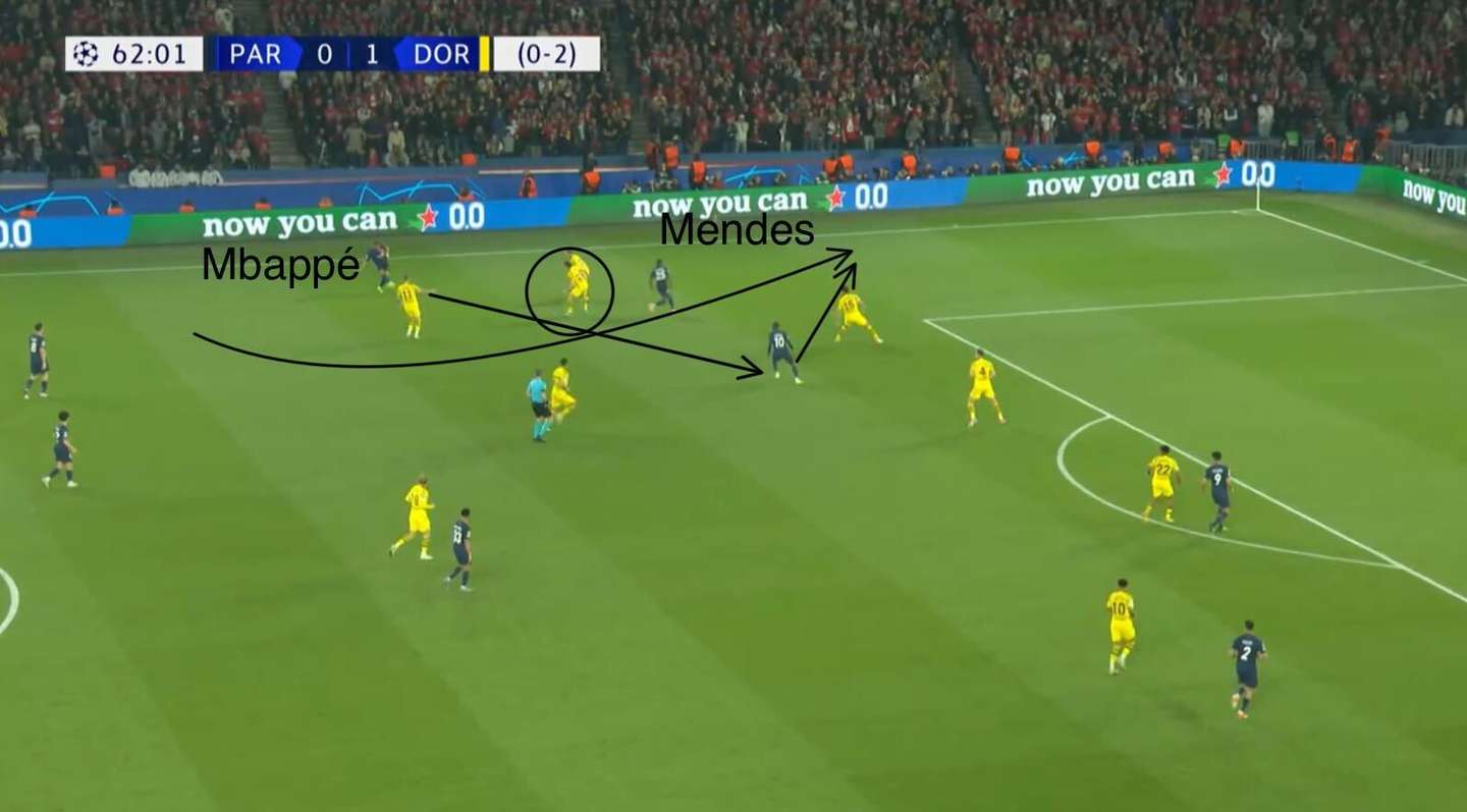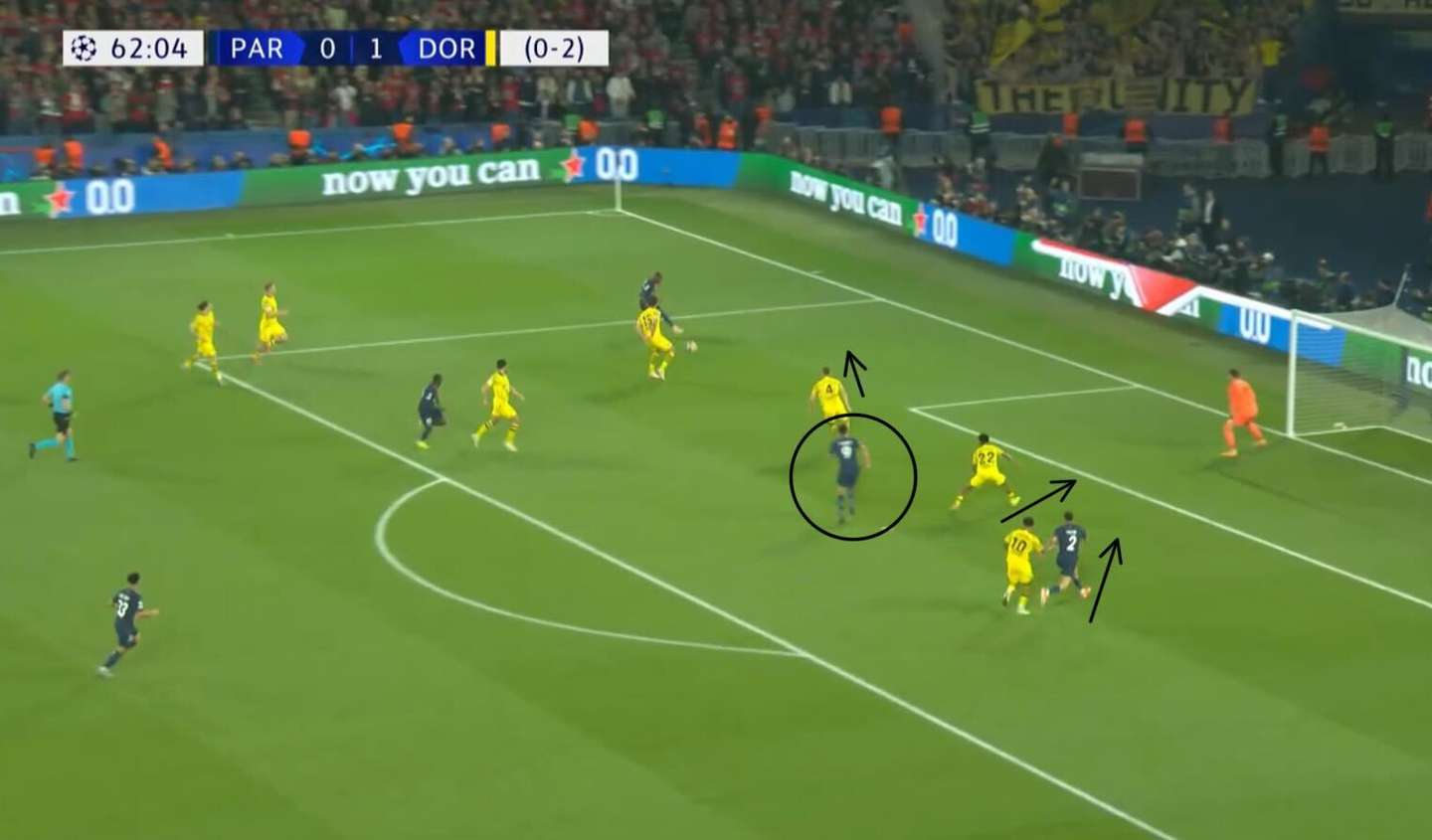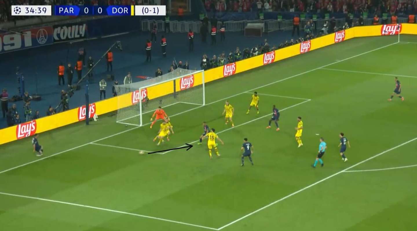Anche lì c’è una lettura errata di Maatsen che, ingannato da una finta di Ramos, o preoccupato da Hakimi alle sue spalle con Sancho in ritardo, si abbassa dentro l’area piccola lasciando a Ramos la ricezione del cut-back di Mendes. Ma per ogni sbavatura del Borussia, c’era una sciatteria del PSG.