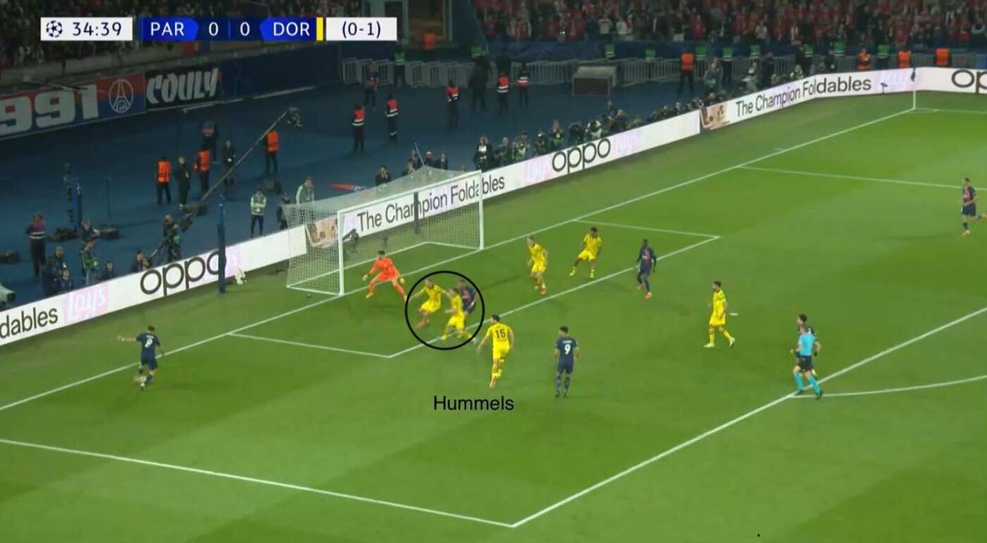 Difendere non è solo una questione di superiorità numerica e, in quel momento, anche se in area di rigore ci sono cinque giocatori del Borussia e tre del PSG, la palla sta per arrivare proprio tra i piedi dell’attaccante più letale, quello costantemente raddoppiato e triplicato. Ma un attimo prima che Mbappé calci, Hummels scivola verso la propria porta e con la gamba sinistra iperestesa devia il pallone quanto basta per mandarlo sui piedi di Schlotterbeck, che spazzando dà il via all’azione d’attacco.